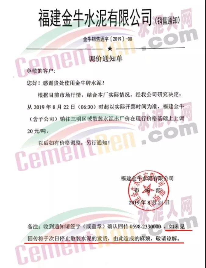 8月26日。福建省謀成水泥發(fā)展有限公司發(fā)布調(diào)價(jià)通知稱:根據(jù)目前市場行情,經(jīng)公司研究決定,自2019年8月27日零時(shí)起,我司各品種袋裝、散裝水泥出廠單價(jià)在原有基礎(chǔ)上上調(diào)20元/噸,本次調(diào)價(jià)為謀成水泥8月份的第二調(diào)價(jià),累計(jì)上調(diào)40元/噸。