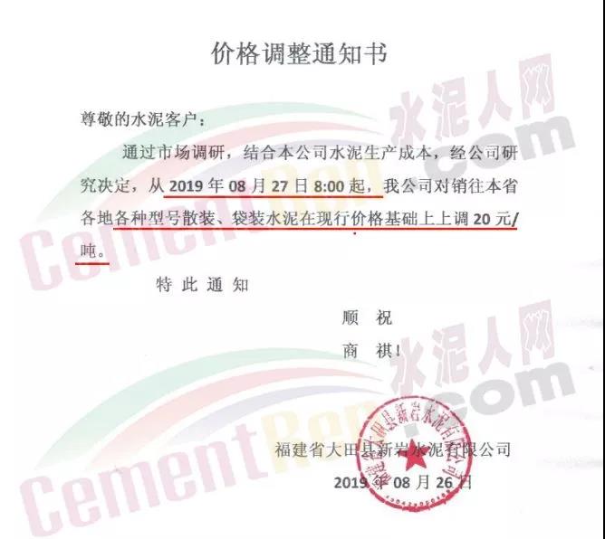 8月26日,福建省大田縣新巖水泥有限公司發(fā)布價(jià)格調(diào)通知稱:通過市場調(diào)研,結(jié)合本公司水泥生產(chǎn)成本,經(jīng)公司研究決定,從2019年8月27日8:00起,我公司對銷往本省各地各種型號散裝、袋裝水泥在現(xiàn)行價(jià)格基礎(chǔ)上上調(diào)20元/噸。