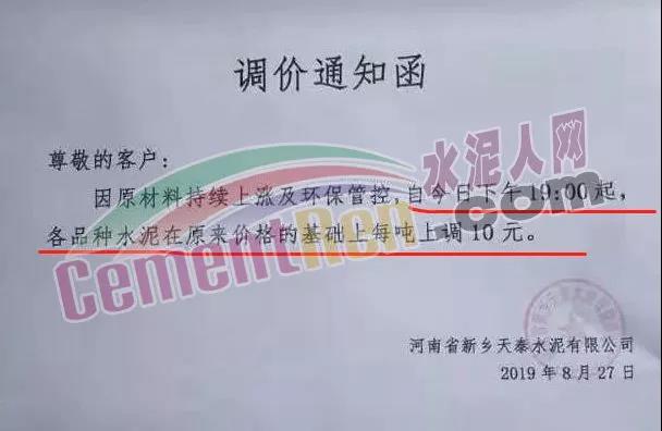 鄭州永華水泥有限公司發(fā)布調(diào)價(jià)函稱因原材料持續(xù)上漲和外部等因素影響,經(jīng)公司研究決定,自2019年9月1日7:30起,各品種水泥在原價(jià)格基礎(chǔ)上,統(tǒng)一上調(diào)20元/噸。