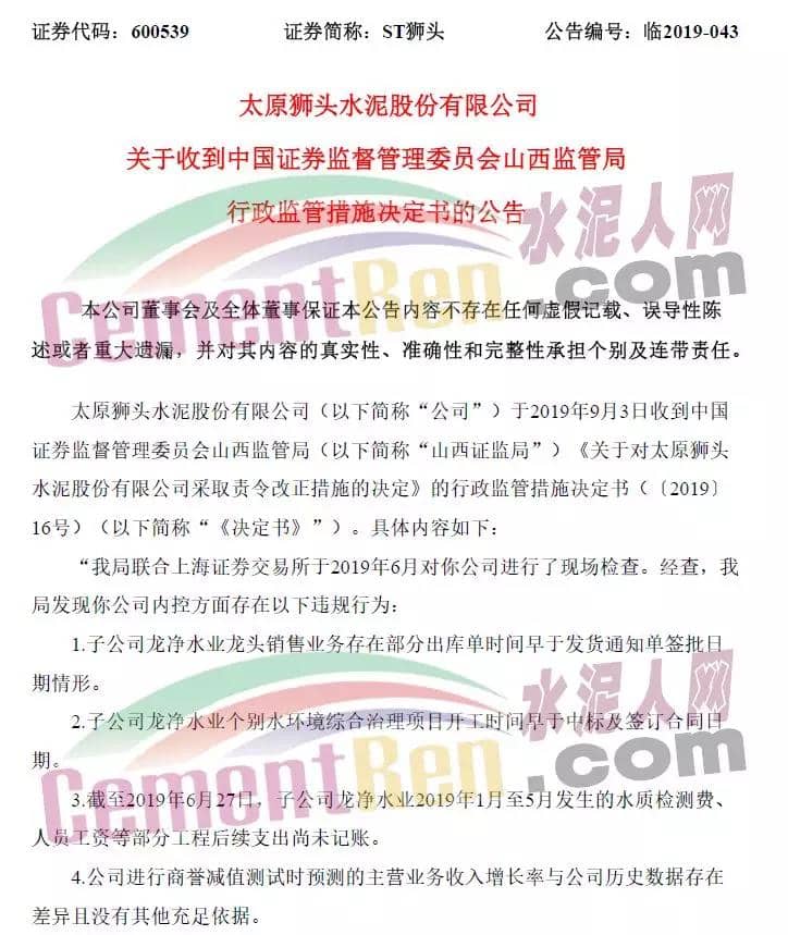 據(jù)證監(jiān)會網(wǎng)站消息,山西監(jiān)管局對太原獅頭水泥股份有限公司(簡稱ST獅頭)采取責令改正措施的決定。經(jīng)查,山西監(jiān)管局發(fā)現(xiàn)ST獅頭內(nèi)控方面存在以下違規(guī)行為: