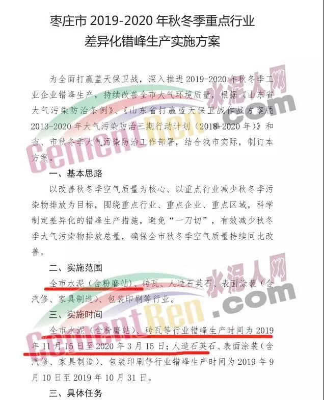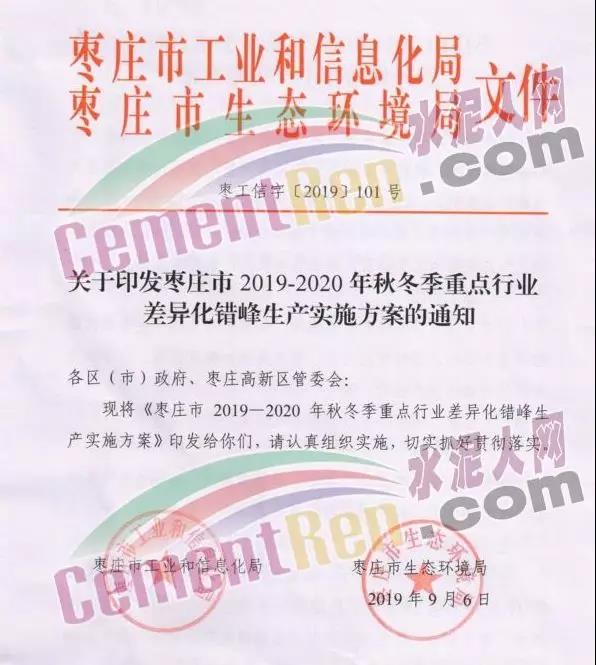 與此同時,水泥大省山東省棗莊市工業(yè)和信息化局、棗莊市生態(tài)環(huán)境局發(fā)布《關(guān)于棗莊市2019~2020年秋冬季重點行業(yè)差異化錯峰生產(chǎn)實施方案的通知》稱,為全面打贏藍天保衛(wèi)戰(zhàn),深入推進2019~2020年秋冬季工業(yè)企業(yè)錯峰生產(chǎn),持續(xù)改善全市大氣環(huán)境質(zhì)量,根據(jù)《山東省大氣污染防治條例》、《山東省打贏藍天保衛(wèi)戰(zhàn)作戰(zhàn)方案暨2013~2020年大氣污染防治三期行動計劃(2018~2020年)》和省、市秋冬季大氣污染防治工作部署,結(jié)合我市實際,制定本方案。