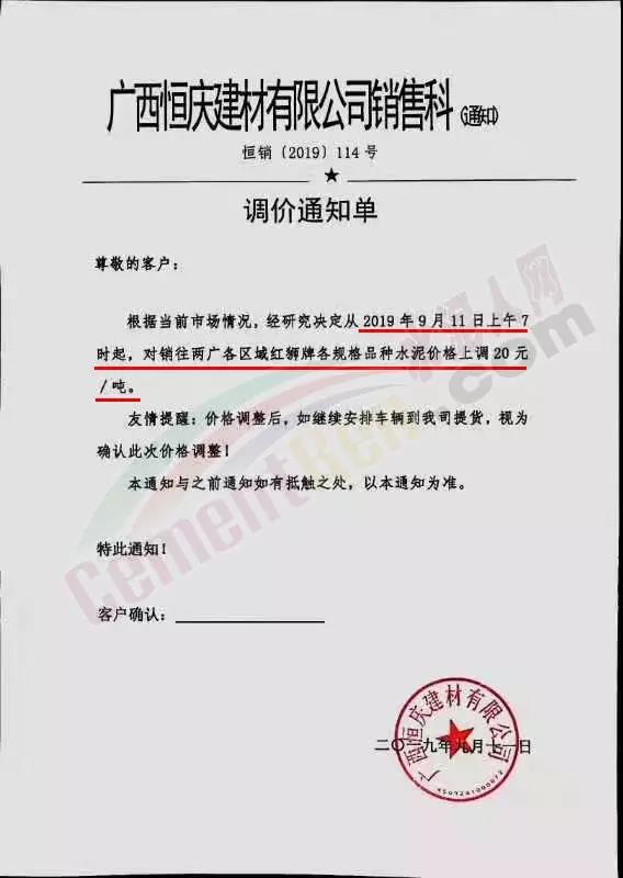 廣西恒慶建材有限公司調(diào)價(jià)通知稱,根據(jù)當(dāng)前市場(chǎng)情況,經(jīng)研究決定從9月11日上午7時(shí)起,對(duì)銷往兩廣各區(qū)域紅獅牌各規(guī)格品種水泥價(jià)格上調(diào)20元/噸。