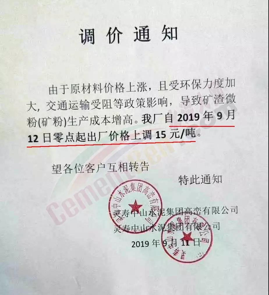 據(jù)水泥人網(wǎng)了解,位于河北省石家莊市靈壽縣的靈壽中山水泥集團(tuán)高巒有限公司昨日(9月11)發(fā)調(diào)價(jià)通知稱,由于原材料價(jià)格上漲,且受環(huán)保力度加大,交通運(yùn)輸受陰等政策影響,導(dǎo)致礦渣微粉(礦粉)生產(chǎn)成本增高。工廠自今日(9月12日)零點(diǎn)起出廠價(jià)格上調(diào)25元/噸。