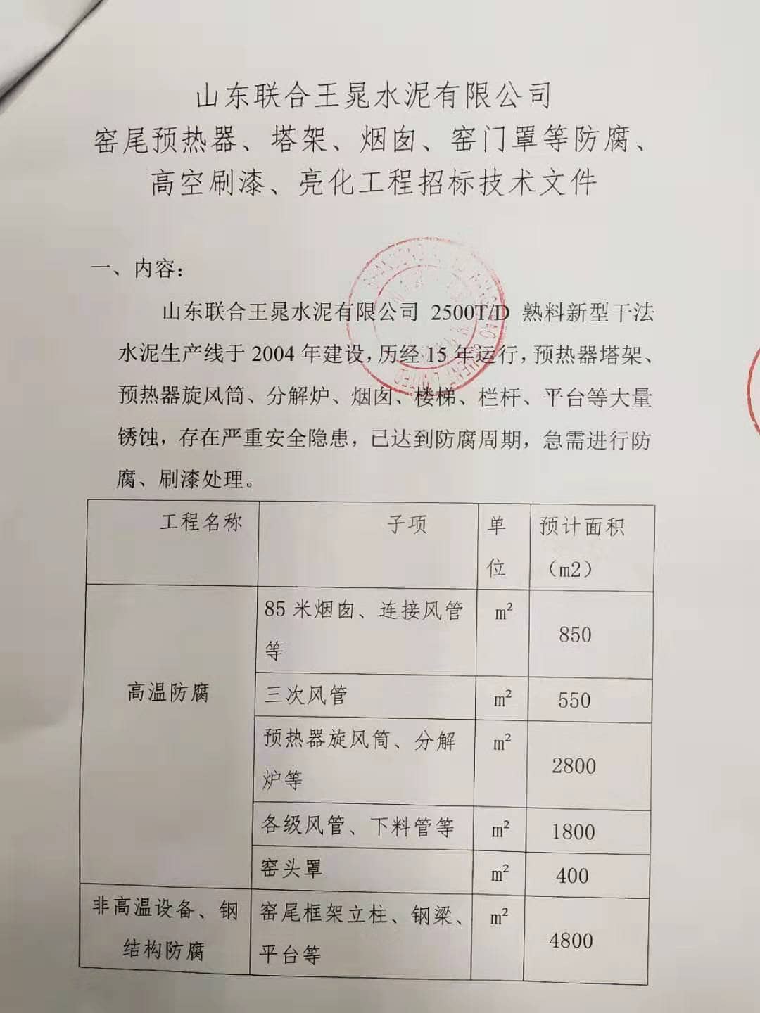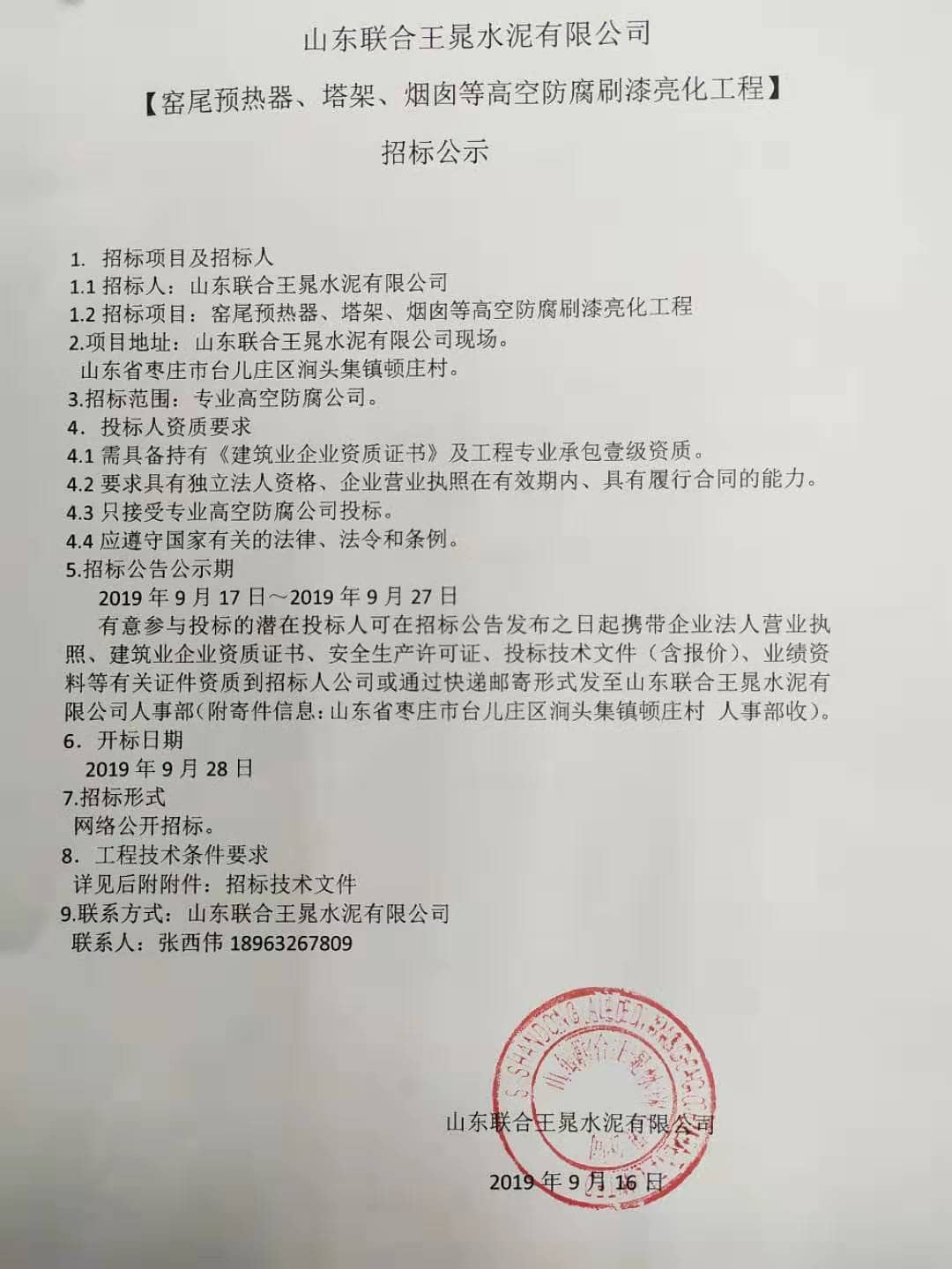 據(jù)水泥人網(wǎng)消息,近日山東聯(lián)合王晁水泥有限公司委托水泥人網(wǎng)針對窯尾預(yù)熱器、塔架、煙囪、窯門罩等防腐、高空刷漆、亮化工程招標(biāo)。