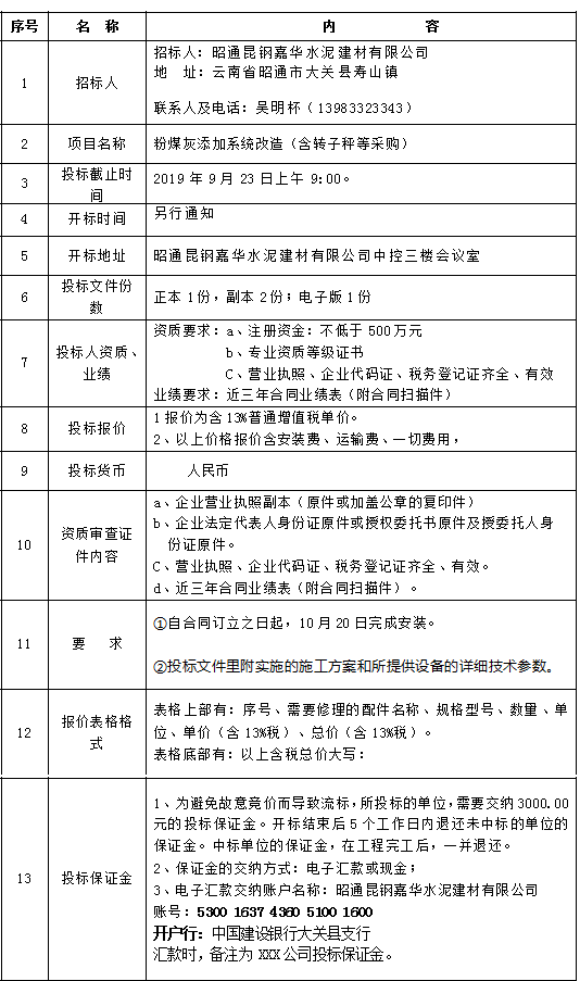 開(kāi)標(biāo)地點(diǎn):昭通昆鋼嘉華水泥建材有限公司中控三樓會(huì)議室(可電話(huà)議標(biāo))