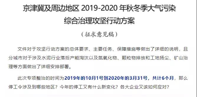 日前,水泥人網(wǎng)轉(zhuǎn)發(fā)了《京津冀及周邊地區(qū)2019-2020 年秋冬季大氣污染綜合治理攻堅(jiān)行動(dòng)方案(征求意見(jiàn)稿)》。并有針對(duì)性的劃出了重點(diǎn)。其中提到國(guó)家相關(guān)部門(mén)將于2019年的10月1日到2020年的3月31日對(duì)2+26城市進(jìn)行環(huán)境問(wèn)題專(zhuān)項(xiàng)整治 。(相關(guān)鏈接:“停工令”又來(lái)了!為期6個(gè)月!涉及28個(gè)城市!)消息一出,引起廣泛關(guān)注。有網(wǎng)友留言稱(chēng),停限產(chǎn)或?qū)?dǎo)致一波水泥價(jià)格上漲。
