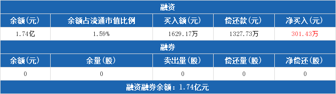 融資方面,當(dāng)日融資買入1629.17萬元,融資償還1327.73萬元,融資凈買入301.43萬元。融券方面,融券賣出0股,融券償還0股,融券余量0股,融券余額0元。融資融券余額合計(jì)1.74億元。