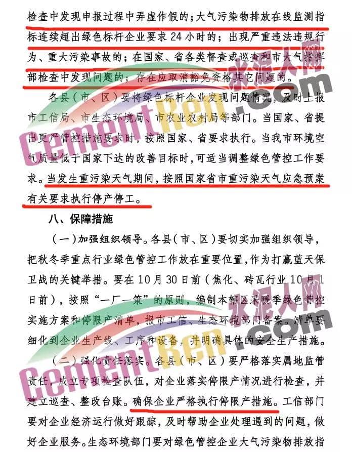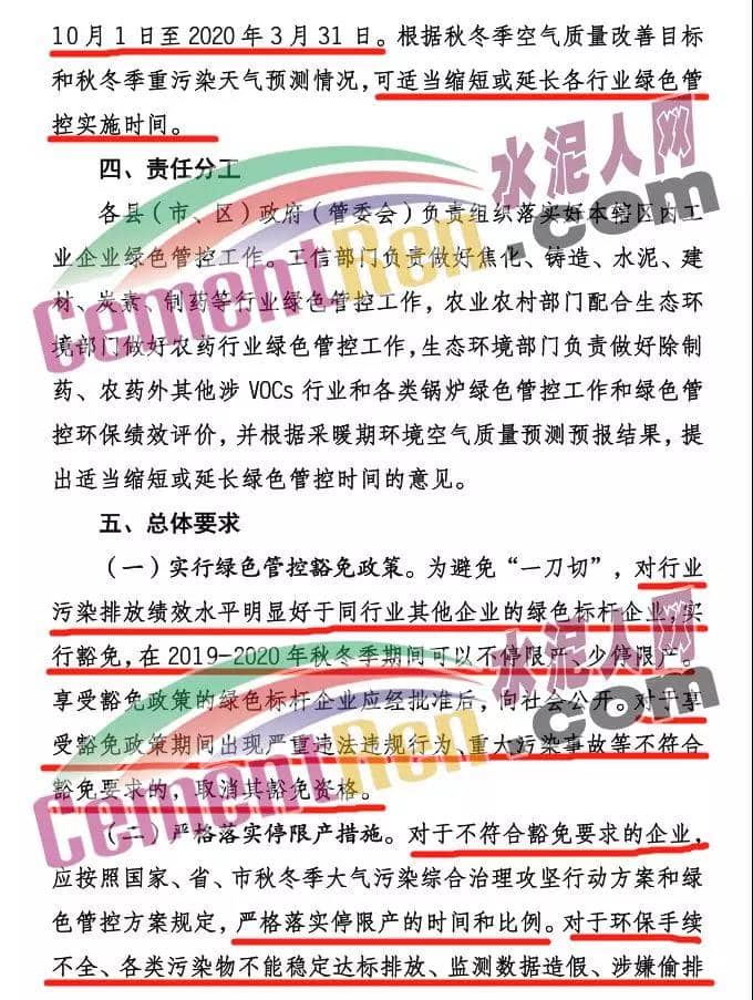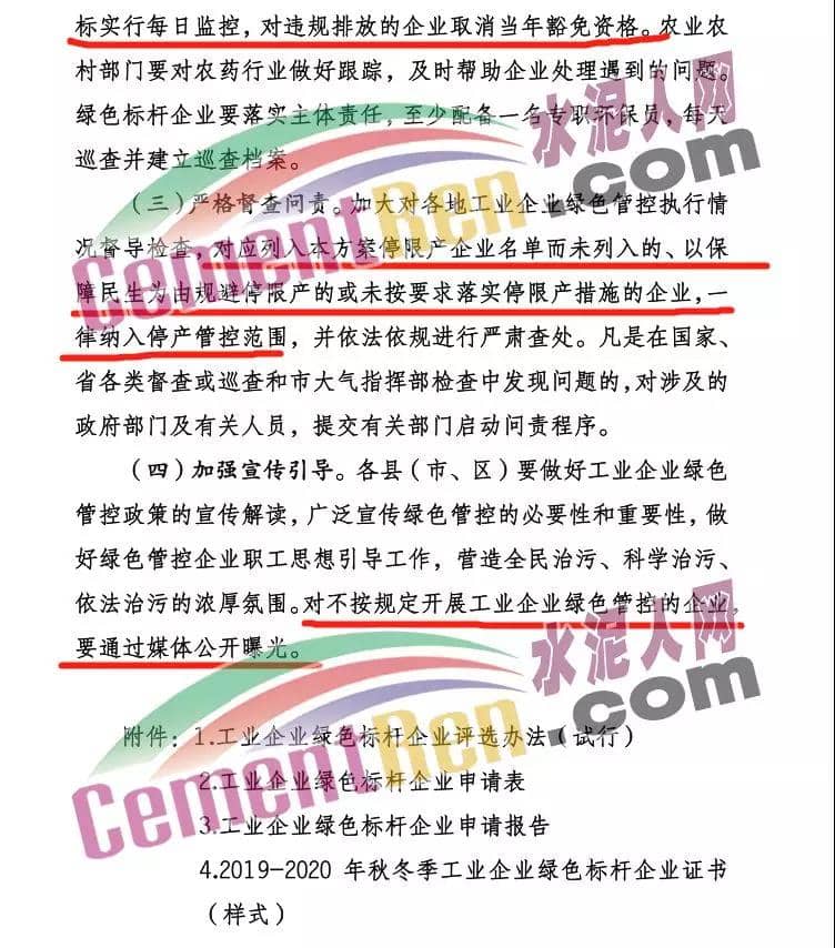 水泥人網(wǎng)消息:日前,山東省濟寧市發(fā)布《濟寧市 2019-2020 年秋冬季工業(yè)企業(yè)綠色管控實施方案(試行)》稱,為貫徹落實《京津冀及周邊地區(qū) 2019-2020年秋冬季大氣污染綜合治理攻堅行動方案》和省 、市秋冬季大氣污染防治方案 ,按照市委、市政府要求,深入推進 2019-2020 年秋冬季 工業(yè)企業(yè)季節(jié)性生產(chǎn)調(diào)控 ,持續(xù)改善區(qū)域空氣質(zhì)量,制定本實施方案?! ≡摲桨傅膶嵤┓秶ǎ簩嵤┓秶ú摹⒔够?、鑄造、 炭 素、玻璃 、涉 涉 VOCs 、各類 鍋爐等行業(yè)企業(yè)。建材行業(yè)主要包括水泥 (含粉磨站) 、陶瓷、磚瓦、石灰 、玻璃棉、石膏板、巖棉、礦物棉等行業(yè)企業(yè)。涉 s VOCs 行業(yè)主要針對涉 s VOCs 排放的制藥工業(yè)、農(nóng)藥工業(yè)、化工、工業(yè)涂裝、家具制造、印刷等行業(yè)企業(yè)?! ?a href="http://www.piarcos.com/news/list_2.html" target="_blank" class="keylink">水泥企業(yè)2019年10月1日至2020年3月31日停限產(chǎn) 實施時間為:工業(yè)企業(yè)秋冬季綠色管控實施時間原則上為秋冬季2019年10月1日至 2020年3月31日。根據(jù)秋冬季空氣質(zhì)量改善目標和秋冬季重污染天氣預測情況,可適當縮短或延長各行業(yè)綠色管控實施時間?! 〗挂坏肚?,綠色標桿企業(yè)減免,為納入的企業(yè)執(zhí)行最嚴停限產(chǎn) 據(jù)水泥人網(wǎng)了解,該方案要求對行業(yè)污染排放績效水平明顯好于同行業(yè)其他企業(yè)的工業(yè)企業(yè),按照《工業(yè)企業(yè)綠色標桿企業(yè)評選辦法(試行)》(附件1 1 )申請綠色標桿企業(yè),經(jīng)屬地政府批準后發(fā)放綠色標桿企業(yè)證書,可按規(guī)定實行不限產(chǎn)或少限產(chǎn)?! 〗ú?水泥熟料、粉磨站、陶瓷、磚瓦、 石灰 、玻璃棉、石膏板、巖棉、礦物棉)、焦化、鑄造、玻璃、炭素、各類鍋爐、涉VOCs等行業(yè)所有企業(yè)要全部納入管控清單,凡是未納入的,采暖季期間按同行業(yè)最嚴標準執(zhí)行停限產(chǎn)?! ζ髽I(yè)落實停限產(chǎn)情況進行檢查,并建立巡查、整改臺賬。確保企業(yè)嚴格執(zhí)行停限產(chǎn)措施;對應列入本方案停限產(chǎn)企業(yè)名單而未列入的、以保障民生為由規(guī)避停限產(chǎn)的或未按要求落實停限產(chǎn)措施的企業(yè),一律納入停產(chǎn)管控范圍,并依法依規(guī)進行嚴肅查處?! 〔膳酒陂g(2019年11月15日—2020年3月15日),滿足A級的企業(yè)可不予限產(chǎn),滿足B級的企業(yè) 在停產(chǎn)不少于連續(xù)續(xù)1個月(12月或1月) ,其他情形的企業(yè)在停產(chǎn)不少于連續(xù)3個月(11月15日 —2月15日或12月15日—3月15日,鼓勵縣市區(qū)分批輪流停產(chǎn))。各 縣(市、區(qū))可根據(jù)目標任務完成情況和管理實際加嚴要求。如山東省水泥協(xié)會出臺更嚴停限產(chǎn)要求,從嚴執(zhí)行 。 采暖季期間(2019年11月15日—2020年3月15日),粉磨站停產(chǎn)不少于連續(xù)2 個月(11月15日—1月15日或1月15 日—3月15日,鼓勵縣市區(qū)分批輪流停產(chǎn))。各縣(市、區(qū))可根據(jù)目標任務完成情況和管理實際加嚴要求。如山東省水泥協(xié)會出臺更嚴停限產(chǎn)要求,從嚴執(zhí)行 。方案全文如下: