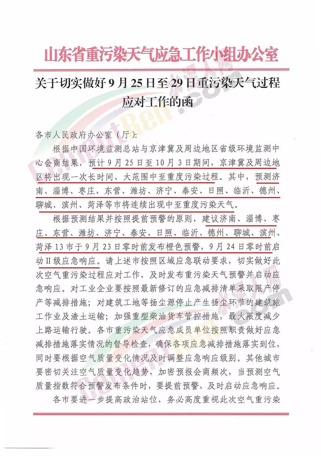 根據(jù)最新氣象預(yù)測預(yù)報和研判結(jié)果,近期我市風(fēng)力較弱,濕度較高,高濕靜穩(wěn)天氣特征顯著,擴散條件較差,污染累積明顯,預(yù)計我市會經(jīng)歷連續(xù)的污染過程。經(jīng)市攻堅指揮部研究決定,自2019年9月23日0時起,我市啟動重污染天氣紅色(Ⅰ級)預(yù)警響應(yīng),各縣(市、區(qū))政府、管委會及市有關(guān)部門要立即采取以下應(yīng)急減排措施: