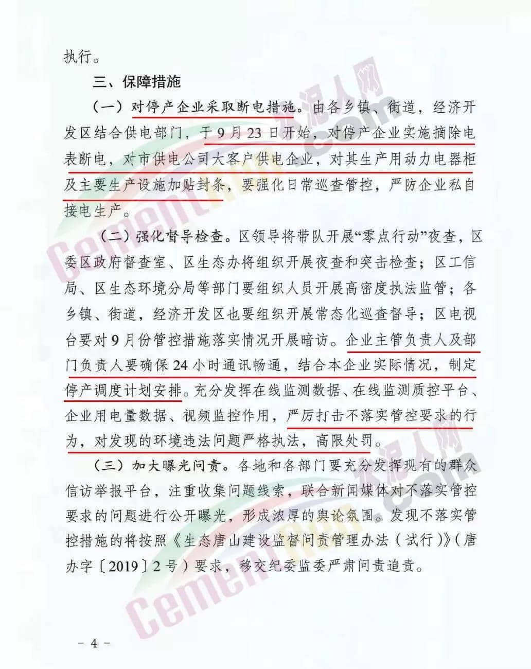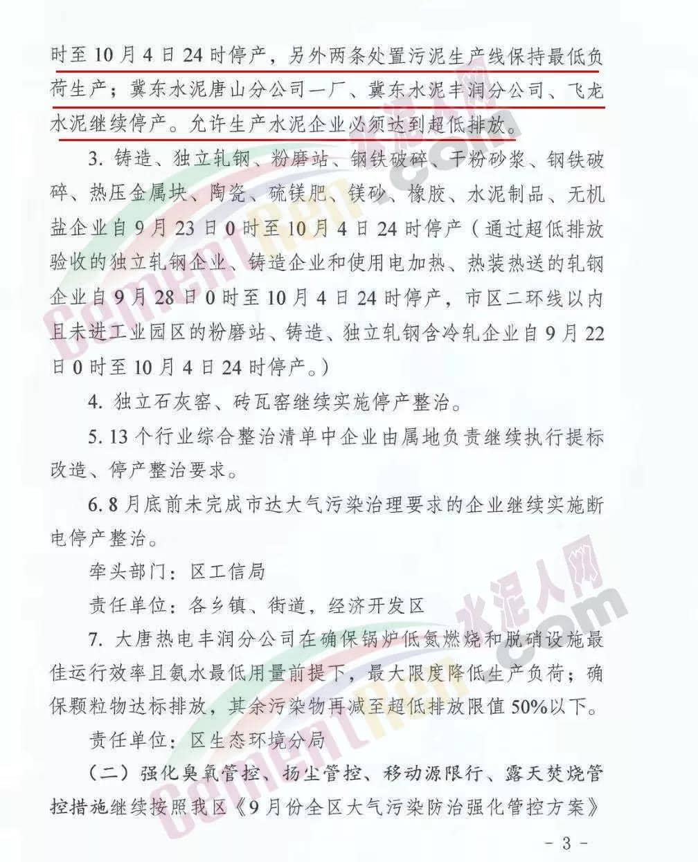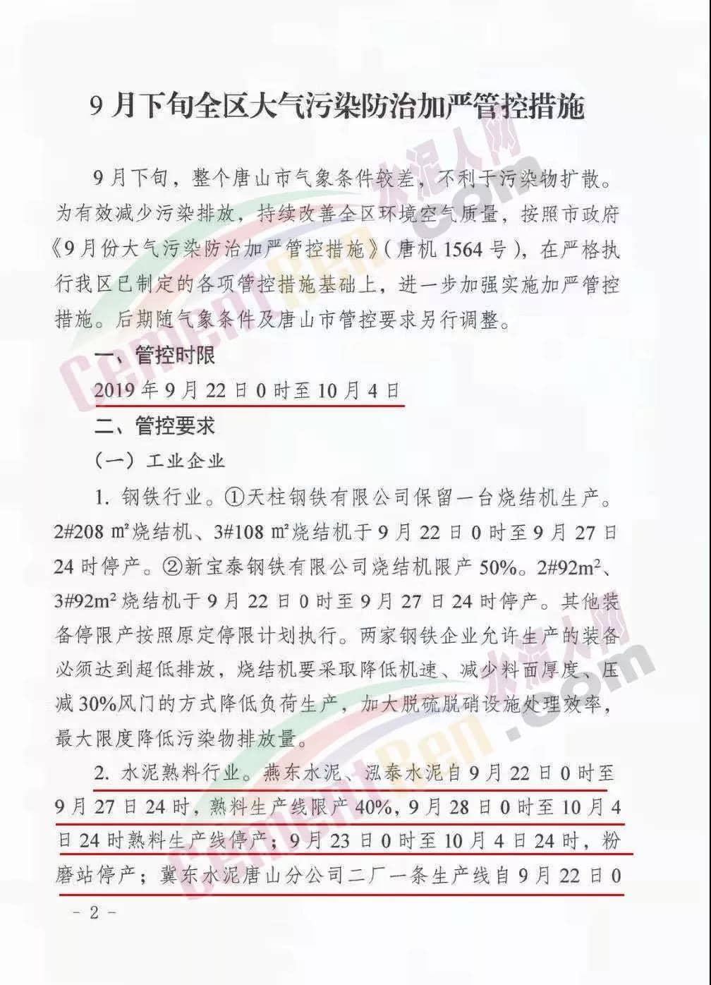 管控時限:2019年9月22日0時至10月4日水泥熟料行業(yè):一、燕東水泥、泓泰水泥自9月22日0時至9月27日24時,熟料生產(chǎn)線限產(chǎn)40%,9月28日0時至10月4日24時熟料生產(chǎn)線停產(chǎn);9月23日0時于10月4日24時,粉磨站停產(chǎn);二、冀東水泥唐山分公司二廠一條生產(chǎn)線自9月22日0時至10月4日24時停產(chǎn),另外兩條處置污泥生產(chǎn)線保持最低負荷生產(chǎn);三、冀東水泥唐山分公司一廠、冀東水泥豐潤分公司、飛龍水泥繼續(xù)停產(chǎn)。允許生產(chǎn)的水泥企業(yè)必須達到超低排放。對于停產(chǎn)企業(yè)采取斷電措施,由各鄉(xiāng)鎮(zhèn)、街道、經(jīng)濟開發(fā)區(qū)結(jié)合供電部門,于9月23日開始,對停產(chǎn)企業(yè)實施摘除電表斷電,對市供電公司大客戶供電企業(yè),對其生產(chǎn)用動力電器柜及主要生產(chǎn)設(shè)施加貼封條,要強化日常巡查管控,嚴防企業(yè)私自接電生產(chǎn)。強化督導(dǎo)檢查期間,區(qū)領(lǐng)導(dǎo)將帶隊開展“零點行動”夜查,區(qū)委區(qū)政府督查室、區(qū)生態(tài)辦將組織開展夜查和突擊檢查等,區(qū)電視臺要對9月份管控措施落實情況開展暗訪。企業(yè)主管負責(zé)人及部分負責(zé)人要確保24小時通訊申通,結(jié)合本企業(yè)實際情況,制定停產(chǎn)調(diào)度計劃安排。嚴厲打擊不落實管控要求的行為,對發(fā)現(xiàn)的環(huán)境違法問題嚴格執(zhí)法,高限處罰?!?月下旬大氣污染防治加嚴管控措施》全文如下: