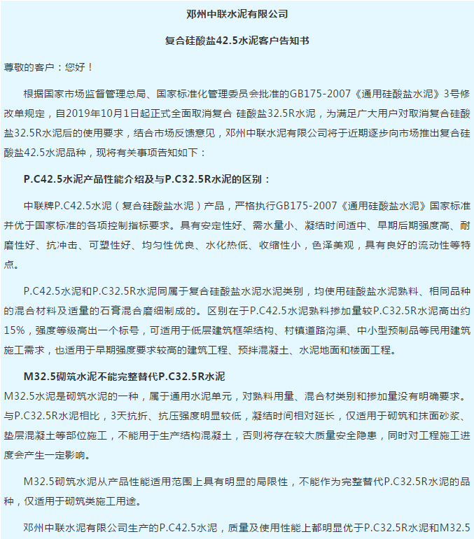 據(jù)水泥人網(wǎng)區(qū)域通知員反饋,繼西峽中聯(lián)水泥發(fā)布新品客戶(hù)告知書(shū)后,近日鄧州中聯(lián)水泥也發(fā)布了復(fù)合硅酸鹽42.5水泥客戶(hù)告知書(shū)以替代即將取消的PC32.5R水泥。鄧州中聯(lián)水泥客戶(hù)告知書(shū)如下: