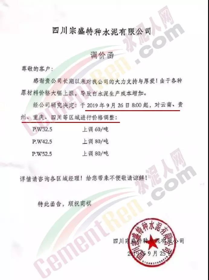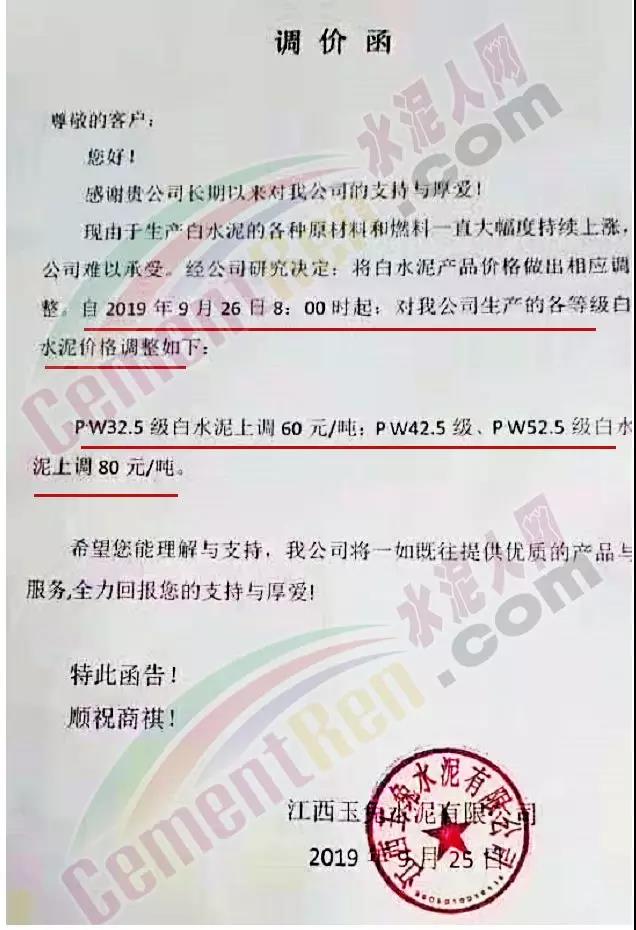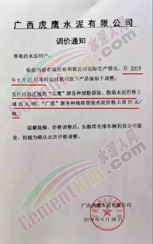 由于原材料價(jià)格上漲,公司經(jīng)營(yíng)成本上升,結(jié)合當(dāng)前市場(chǎng)行情變化,經(jīng)公司研究決定于2019年9月26日8:00開始對(duì)隆回區(qū)域各品種水泥價(jià)格上調(diào)30元/噸。