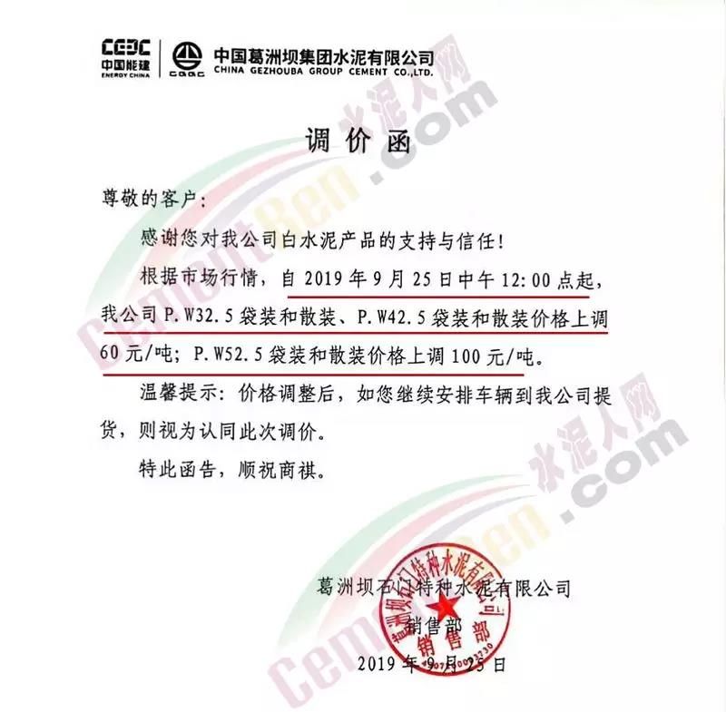 根據(jù)當(dāng)前市場(chǎng)形勢(shì)及我司生產(chǎn)情況,我公司決定于2019年9月26日8時(shí),上調(diào)所有品種袋裝、散裝水泥價(jià)格30元/噸。價(jià)格上調(diào)以我司出廠過磅時(shí)間為準(zhǔn),如您繼續(xù)安排提貨,則視為認(rèn)同此次價(jià)格調(diào)整。順祝商祺!