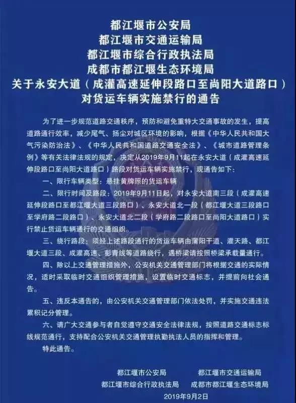 四川?。簢鴳c期間全天禁行1、全省高速公路禁止危險化學品運輸車輛通行。2、成都市全市每日07:30-20:00限行國四以下排放貨車。