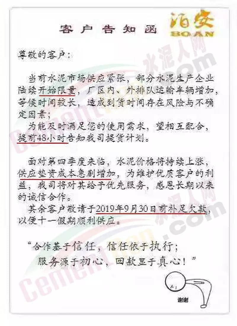 水泥人網(wǎng)通訊員消息:日前,泊安水泥發(fā)布客戶告知函稱,當前水泥市場供應緊張,部分水泥生產(chǎn)企業(yè)陸續(xù)開始限量,廠區(qū)內(nèi)、外排隊運輸車輛增加,等候時間較長,造成到貨時間存在風險與不確定因素;為能及時滿足客戶使用需求,須提前48小時告知提貨計劃。面對第四季度來臨,水泥價格將持續(xù)上漲,供應墊資成本急需增加,為維護優(yōu)質(zhì)客戶的利益,公司將對其給予優(yōu)先服務,其余客戶須于9月30日前補足欠款,以便十一假期順利供應。