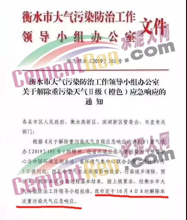 據(jù)水泥人網(wǎng)消息,衡水市大氣污染防治工作領(lǐng)導(dǎo)小組辦公室發(fā)布《關(guān)于解除重污染天氣II級(橙色)應(yīng)急響應(yīng)的通知》稱,根據(jù)《關(guān)于解除重污染天氣II級應(yīng)急響應(yīng)的通知》(冀氣領(lǐng)辦【2019】195號(hào))的精神,經(jīng)省環(huán)境應(yīng)急與重污染天氣預(yù)警中心與中國環(huán)境監(jiān)測總站、省環(huán)境氣象中心聯(lián)合會(huì)商,預(yù)計(jì)10月3日夜間起,西北冷空氣自北向南影響河北省,污染逐步清除。預(yù)計(jì)4日衡水市本次污染過程基本結(jié)束,按上級要求,經(jīng)衡水市大氣污染防治工作領(lǐng)導(dǎo)小組批準(zhǔn),衡水市定于10月4日8時(shí)解除本次重污染天氣應(yīng)急響應(yīng)。 原文如下: