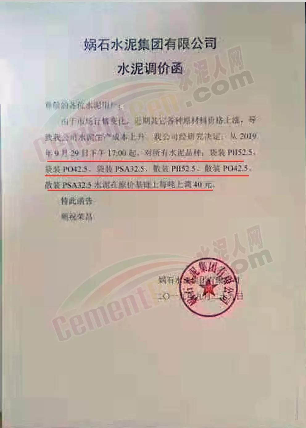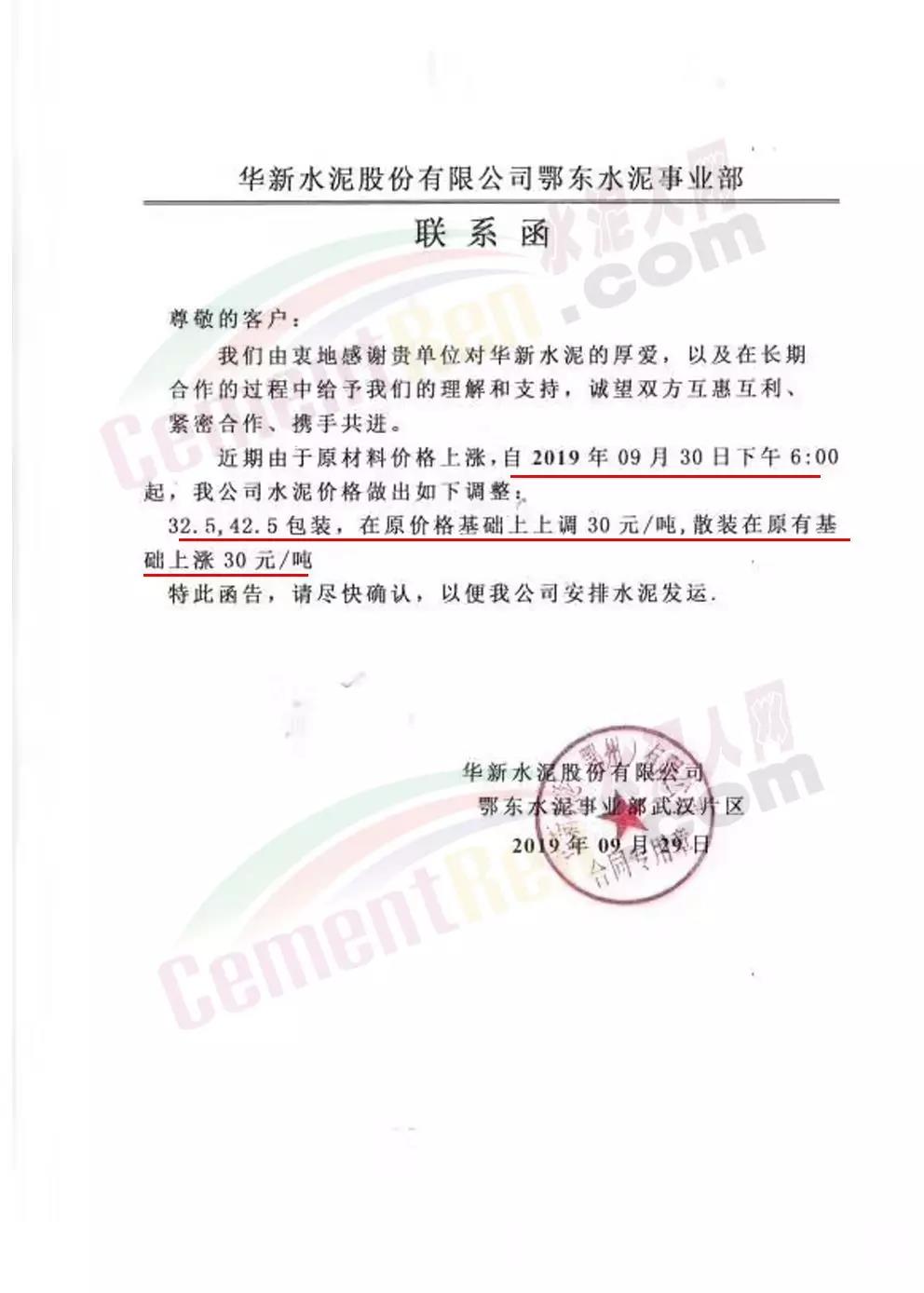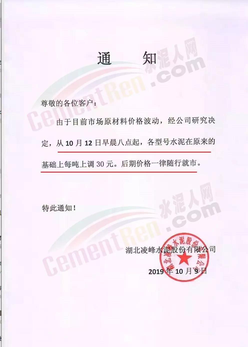 您好!感謝一直以來給予我公司的大力支持!因近期市場行情發(fā)生變化,為了公司的健康發(fā)展、保證產(chǎn)品和服務質(zhì)量,更好地加強貴我雙方的長期協(xié)作,經(jīng)我公司研究決定自2019年10月8日00:00時起,32.5R級別袋裝、散裝品種水泥出廠價在原基礎上上調(diào)30元/噸;42.5R級別袋裝、散裝品種水泥出廠價在原基礎上上調(diào)40元/噸;如您繼續(xù)安排車輛到我公司提貨,則視為您同意和確認此次價格調(diào)整,不便之處,敬請理解順頌商祺!