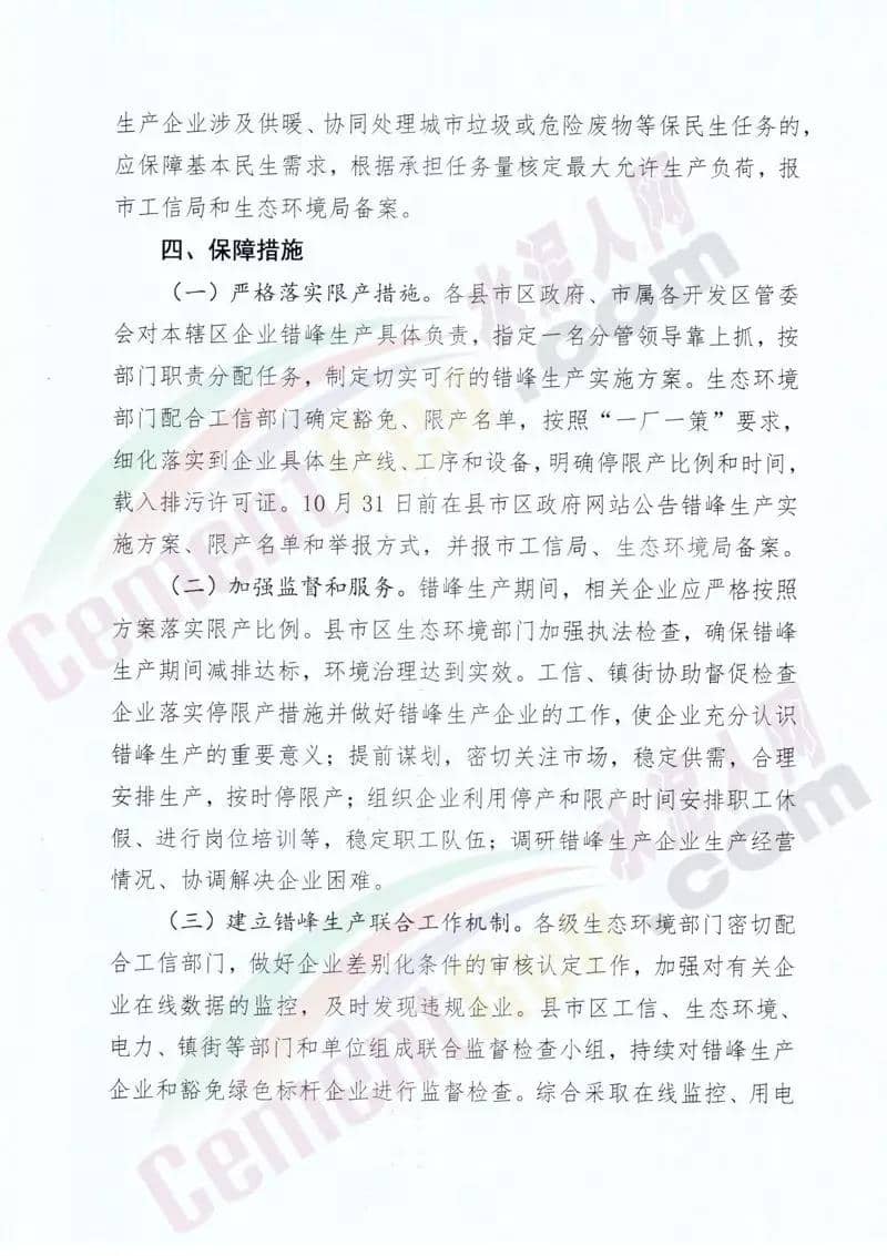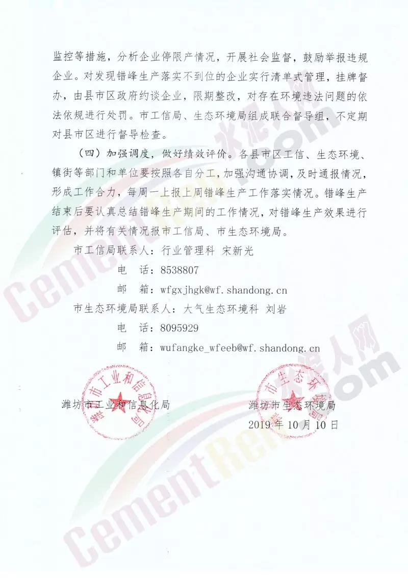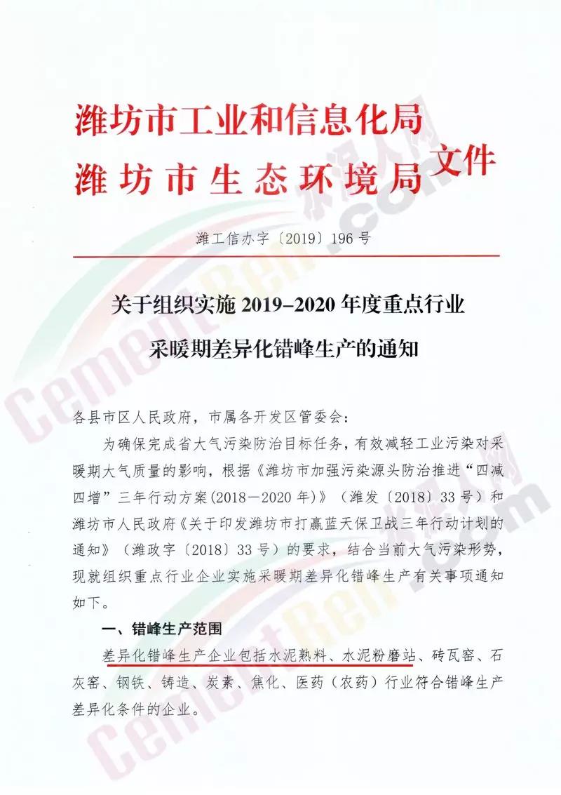 水泥人網(wǎng)消息:山東濰坊市工信局,維坊市生態(tài)環(huán)境局聯(lián)合發(fā)布《關(guān)于組織實(shí)施2019-2020年度重點(diǎn)行業(yè)采暖期差異化錯(cuò)峰生產(chǎn)的通知 》。通知稱:差異化錯(cuò)峰生產(chǎn)企業(yè)包括 水泥熟料、水泥粉磨站等。對行業(yè)污染排放績效水平明顯好于同行業(yè)其他 企業(yè)滿綠色標(biāo)桿企業(yè)條件的實(shí)施錯(cuò)峰生產(chǎn)豁免。對水泥企業(yè)熟料生產(chǎn)線實(shí)施停產(chǎn),水泥粉磨站限產(chǎn)50%。通知原文如下: