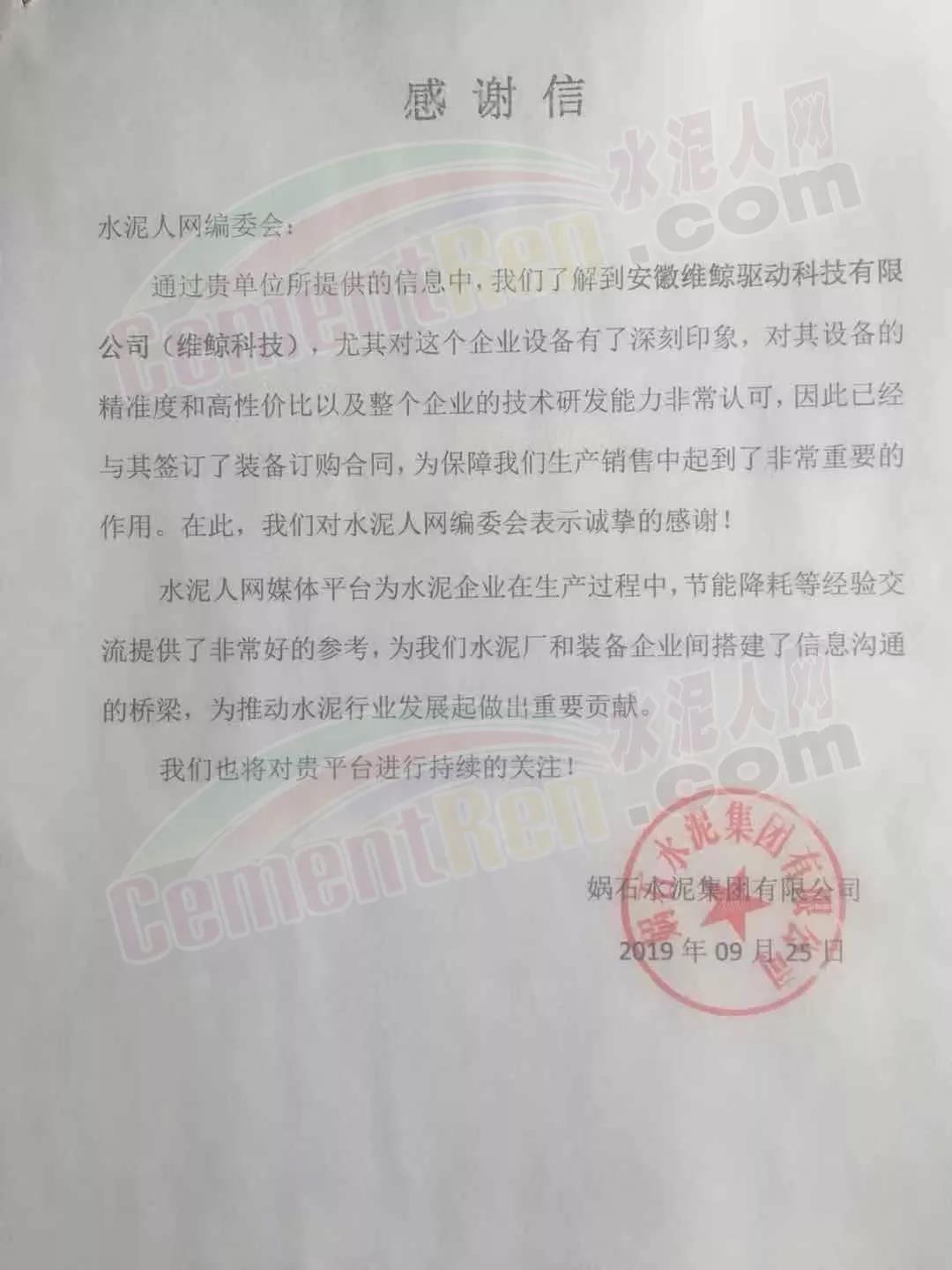 近日,水泥人網(wǎng)收到來(lái)自媧石水泥的一封《感謝信》,稱水泥人網(wǎng)為媧石水泥和裝備企業(yè)之間的戰(zhàn)略合作搭建了信息溝通的橋梁。