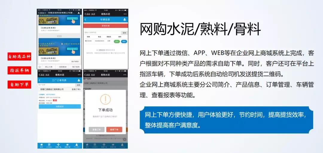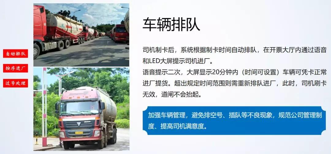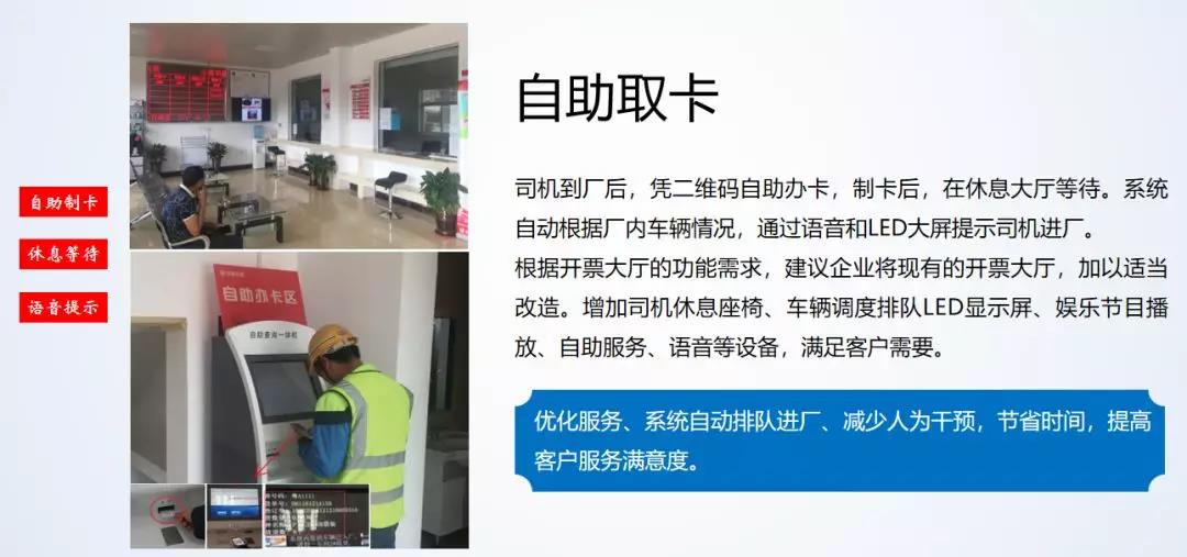 河南志信自主研發(fā)的智能物流一卡通系統(tǒng)可實(shí)現(xiàn)水泥/熟料/骨料/等產(chǎn)品的網(wǎng)上銷售和智能發(fā)運(yùn),選產(chǎn)品、自助派車、付款、自動(dòng)推送提貨二維碼,兩三分鐘就可以完成,有效提升了提貨效率。通過(guò)對(duì)門(mén)禁、地磅、裝車現(xiàn)場(chǎng)的硬件改造升級(jí),以及軟件的優(yōu)化,實(shí)現(xiàn)車輛自動(dòng)排隊(duì),司機(jī)憑卡進(jìn)廠提貨,出廠自助收卡打印,真正實(shí)現(xiàn)了“一卡通”服務(wù)。具體業(yè)務(wù)流程見(jiàn)以下介紹: