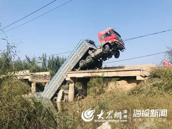 經(jīng)初步調(diào)查,13日凌晨4點(diǎn)左右,一輛魯MAN226冀JSH50掛重型半掛貨車沿渤海十八路由南向北行駛至市西辦事處李茂家村附近,右轉(zhuǎn)彎進(jìn)入連接渤海十八路與李茂家村村西鄉(xiāng)間路的一座寬4米左右的小橋時(shí),致使橋面坍塌。現(xiàn)場(chǎng)貨車呈翹起之勢(shì),車頭懸于半空中,車尾插入水中,事故未造成人員傷亡。