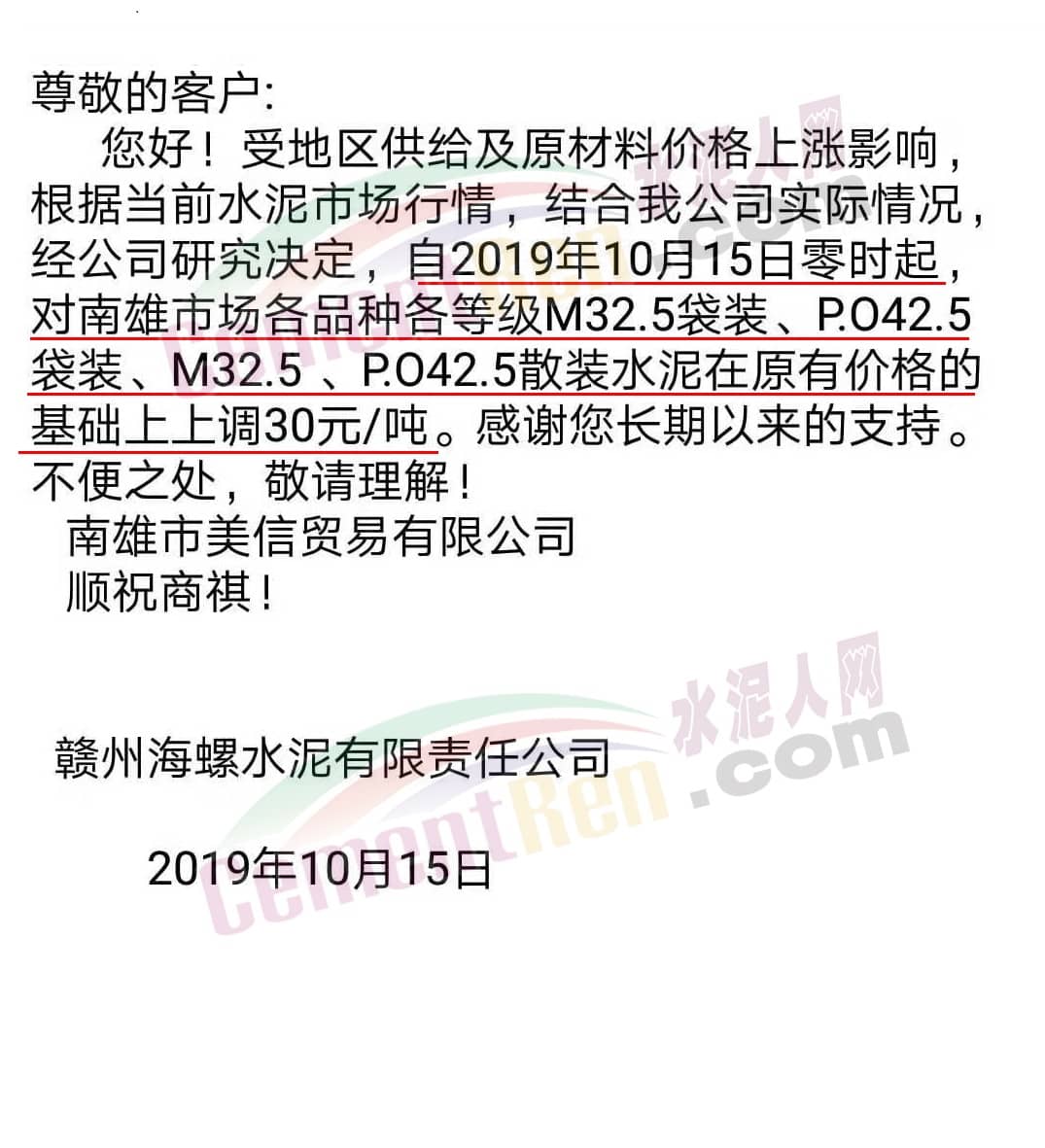 江西萬年青水泥股份有限公司贛州銷售部通知稱自15日8時起,公司發(fā)往大余、南雄市的民用、工程市場的各品種袋、散裝水泥出廠價格在原有價格基礎上上調30元/噸。