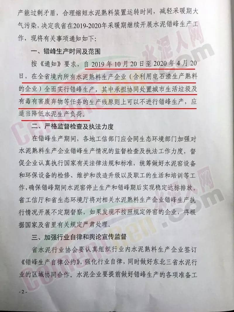 日前,黑龍江工信廳聯(lián)合生態(tài)環(huán)境廳聯(lián)合發(fā)布《關(guān)于做好黑龍江省2019-2020年采暖期水泥錯峰生產(chǎn)工作的通知》稱:按照工信部、環(huán)境部關(guān)于進一步做好水泥錯峰生產(chǎn)的通知要求,為進一步貫徹落實相關(guān)政府文件要求化解黑龍江省水泥行業(yè)產(chǎn)能過剩矛盾,合理縮短水泥熟料裝置運轉(zhuǎn)時間,減輕采暖期大氣污染,決定黑龍江省2019-2020年采暖期繼續(xù)開展水泥錯峰生產(chǎn)工業(yè)。錯峰生產(chǎn)時間及范圍:2019年10月20日至2020年4月20日在黑龍江全省所有水泥熟料生產(chǎn)企業(yè)(含利用電石渣生產(chǎn)熟料的企業(yè))全面實行錯峰生產(chǎn),其中承擔協(xié)同處置城市生活垃圾及有害廢棄物等任務(wù)的生產(chǎn)線上可以不進行錯峰生產(chǎn),應適當降低水泥生產(chǎn)負荷。通知原文如下: