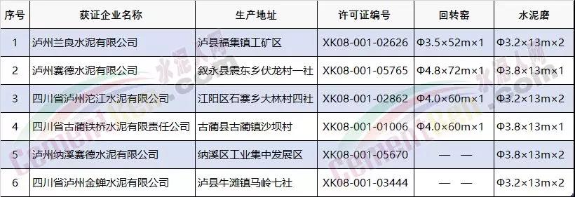 據(jù)查詢,市場(chǎng)監(jiān)管總局工業(yè)品生產(chǎn)許可證辦公室數(shù)據(jù)顯示四川省瀘州市6家已取得工業(yè)品生產(chǎn)許可證的水泥企業(yè)中瀘州蘭良水泥有限公司、瀘州賽德水泥有限公司、四川省瀘州沱江水泥有限公司、四川省古藺鐵橋水泥有限責(zé)任公司4家企業(yè)關(guān)鍵設(shè)備中包括熟料生產(chǎn)工序關(guān)鍵設(shè)備回轉(zhuǎn)窯及水泥生產(chǎn)工序關(guān)鍵設(shè)備水泥磨;而瀘州納溪賽德水泥有限公司和四川省瀘州金蟬水泥有限公司關(guān)鍵設(shè)備僅包括水泥磨。