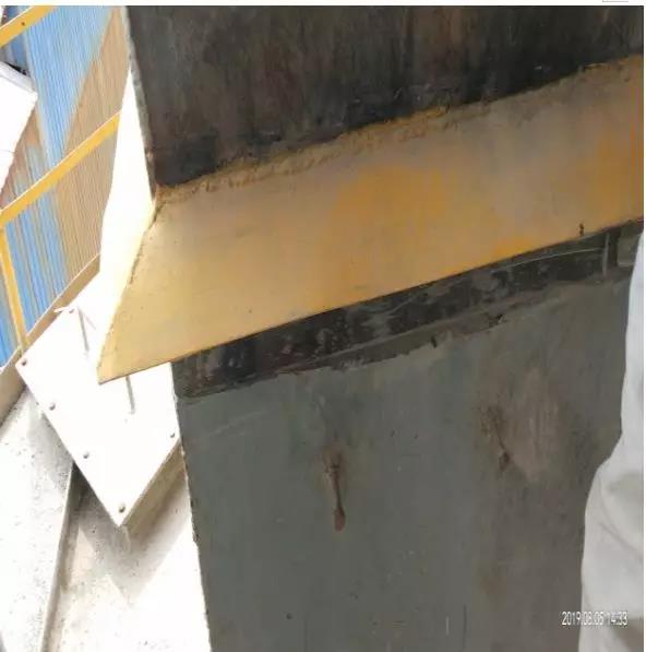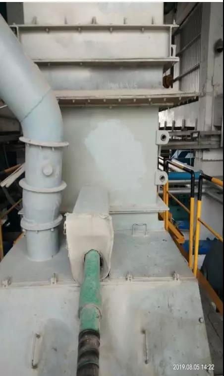 軟連接會出現(xiàn)漏風(fēng)或密封不嚴(yán)從而導(dǎo)致冒灰現(xiàn)象,并且經(jīng)常出現(xiàn)軟連接位置磨透冒灰,帶來環(huán)保問題;軟連接接口處特別容易卡料、積灰,造成軟連接成“硬連接”從而導(dǎo)致倉重不準(zhǔn)。另外稱重倉是輥壓機系統(tǒng)物料粉碎、熱交換轉(zhuǎn)接點,倉內(nèi)產(chǎn)生蒸氣、粉塵,對倉壁、倉頂粘貼嚴(yán)重。(如圖3)