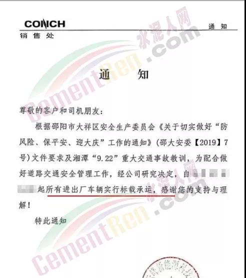 海螺集團(tuán)旗下邵陽(yáng)市云峰新能源科技有限公司發(fā)布通知稱,為配合邵陽(yáng)市大祥區(qū)安委會(huì)文件要求及湘潭"9.22"重大交通事故教訓(xùn),為配合做好道路交通安全管理工作,經(jīng)公司研究決定,即日起所有進(jìn)出廠車輛實(shí)行標(biāo)載承運(yùn)。