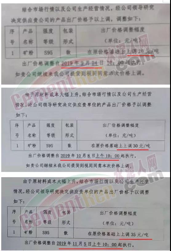 從9月下旬起,局部區(qū)域企業(yè)S95礦粉已經(jīng)三次發(fā)布調(diào)價(jià)通知,合計(jì)漲幅近100元,并且供貨緊張。