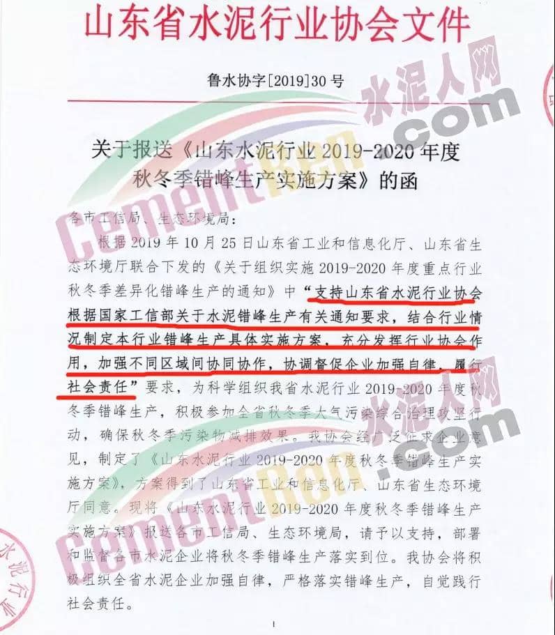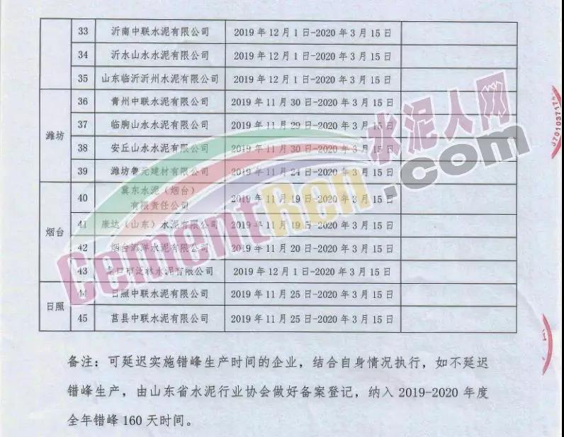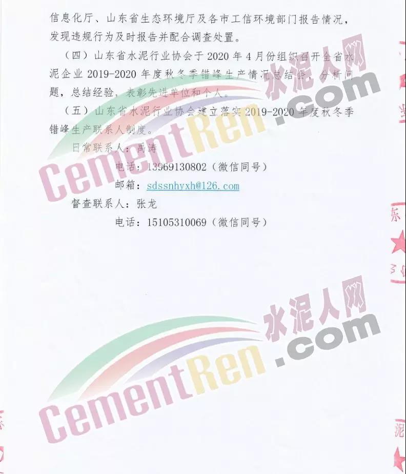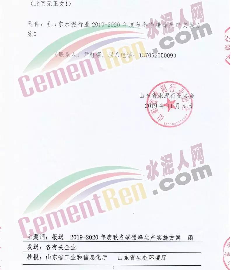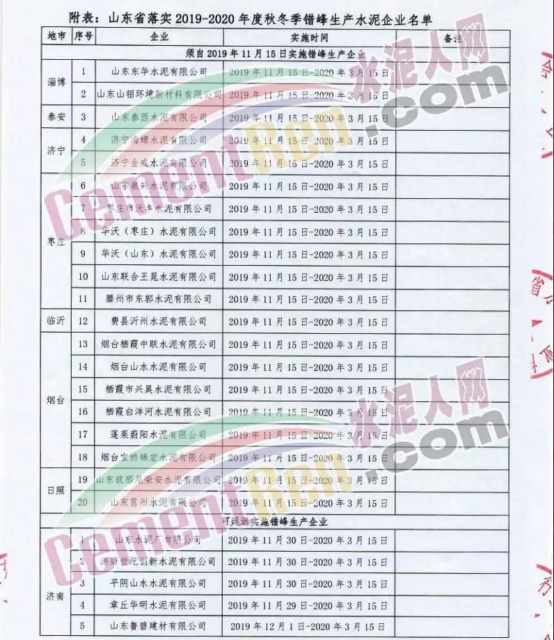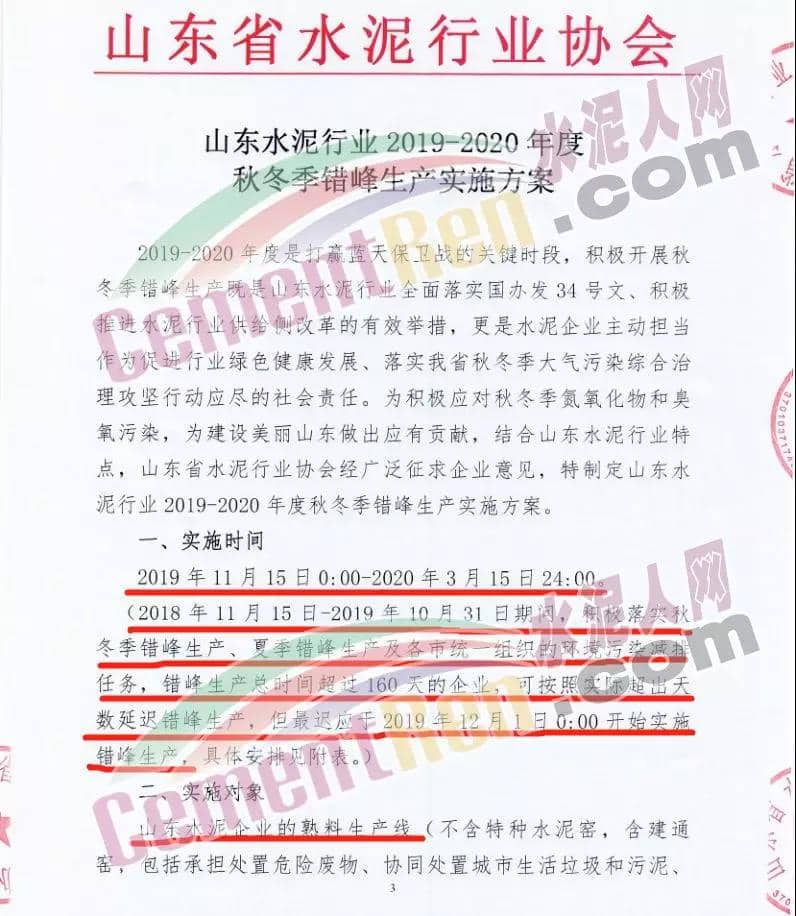 一、實(shí)施時(shí)間: 2019年11月15日0時(shí)-2020年3月15日24時(shí)。(2018年11月15日-2019年10月31日期間,積極落實(shí)秋冬季錯(cuò)峰生產(chǎn)、夏季錯(cuò)峰生及各市統(tǒng)一組織的環(huán)境污染減排任務(wù),錯(cuò)峰生產(chǎn)總時(shí)間超過160天的企業(yè),可按照實(shí)際超出天數(shù)延遲錯(cuò)峰生產(chǎn),但最遲應(yīng)于2019年12月1日0時(shí)開始實(shí)施錯(cuò)峰生產(chǎn),具體安排見附表。)二、實(shí)施對(duì)象: 山東水泥企業(yè)的熟料生產(chǎn)線(不含特種水泥窯,含建通窯,包括承擔(dān)處置危險(xiǎn)廢物、協(xié)同處置城市生活垃圾和污泥、居民供暖等保民生任務(wù)的生產(chǎn)線,下同)。(企業(yè)名單見附表); 錯(cuò)峰生產(chǎn)期間各市、縣(市、區(qū))人民政府及工信環(huán)境部門組織粉磨站和特種水泥窯采取停產(chǎn)減排措施的,按照各市、縣(市、區(qū))人民政府及相關(guān)部門文件執(zhí)行。三、保障措施 1、原則上水泥企業(yè)不再承擔(dān)保民生任務(wù)。有特殊情況需承擔(dān)民生任務(wù)的,實(shí)行“一事一報(bào)”,相關(guān)企業(yè)于2019年11月6日前向所在市工信部門提交申請(qǐng)方案,接受申請(qǐng)的市工信部門聯(lián)合市環(huán)境部門于2019年11月9日前向社會(huì)公示申請(qǐng)方案,并報(bào)本市人民政府審批,批準(zhǔn)后于2019年11月12日前分別報(bào)山東省工業(yè)和信息化廳、山東省生態(tài)環(huán)境廳備案。 2、承擔(dān)保民生任務(wù)的企業(yè)于2019年11月12日前將申請(qǐng)方案和市人民政府批準(zhǔn)文件報(bào)山東省水泥行業(yè)協(xié)會(huì)備案?! ?、秋冬季錯(cuò)峰生產(chǎn)期間承擔(dān)保民生任務(wù)企業(yè)的減排任務(wù)不得豁免,相關(guān)企業(yè)申請(qǐng)保民生任務(wù)的方案中必須包括秋冬季錯(cuò)峰生產(chǎn)結(jié)束后補(bǔ)齊錯(cuò)峰生產(chǎn)時(shí)間的計(jì)劃安排,且補(bǔ)停窯時(shí)間不沖抵山東省水泥行業(yè)協(xié)會(huì)組織的2020年夏季及特殊天氣情況下組織的水泥企業(yè)不少于40天的錯(cuò)峰生產(chǎn)時(shí)間。全文如下: