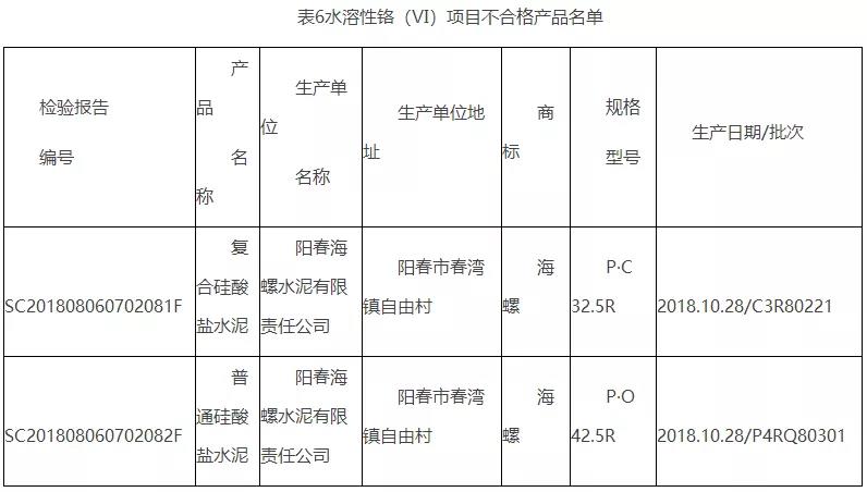 經(jīng)檢驗發(fā)現(xiàn)陽春海螺水泥有限責(zé)任公司生產(chǎn)的2批次產(chǎn)品不合格。不合格項目為“水溶性鉻(Ⅵ)”。