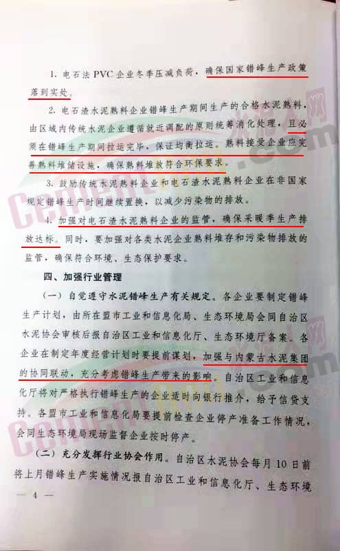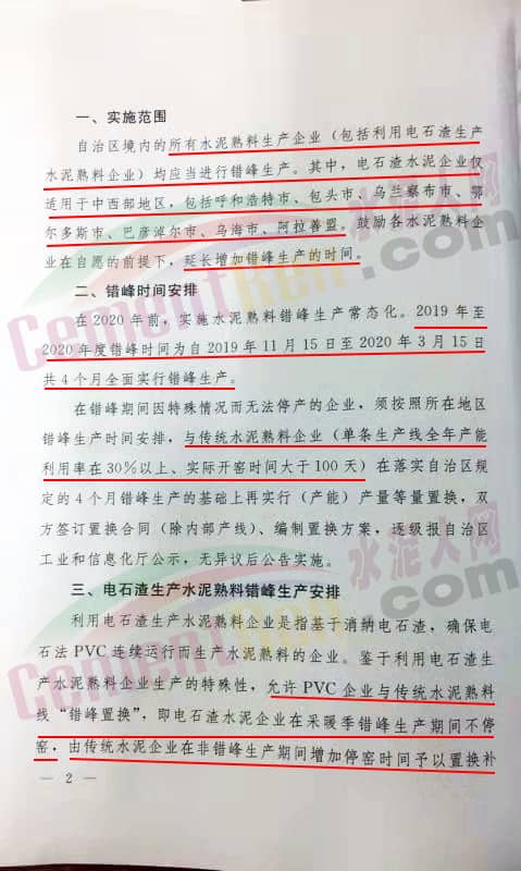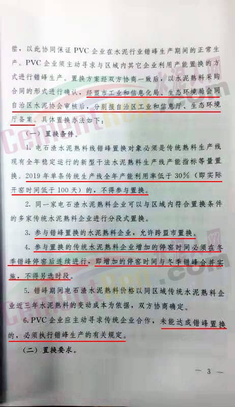 一、實(shí)施范圍 自治區(qū)境內(nèi)的所有水泥熟料生產(chǎn)企業(yè)(包括利用電石渣生產(chǎn)水泥熟料企業(yè))均應(yīng)當(dāng)進(jìn)行錯(cuò)峰生產(chǎn)。其中電石渣水泥企業(yè)僅適用于中西部地區(qū),包括呼和浩特市、包頭市、 烏蘭察布市、鄂爾多斯市、巴彥淖爾市、烏海市、阿拉善盟7個(gè)地區(qū),鼓勵(lì)個(gè)水泥熟料企業(yè)在自愿的前提下,延長(zhǎng)增加錯(cuò)峰生產(chǎn)時(shí)間。 二、錯(cuò)峰時(shí)間安排 2019年至2020年度錯(cuò)峰時(shí)間為自2019年11月15日至2020年3月15日共4個(gè)月全面實(shí)行錯(cuò)峰生產(chǎn)?! ≡阱e(cuò)峰期間因特殊情況而無(wú)法停業(yè)的企業(yè),必須按照所在地區(qū)錯(cuò)峰時(shí)間安排,與傳統(tǒng)水泥熟料企業(yè)(單條生產(chǎn)線全年產(chǎn)能利用率在30%以上,以實(shí)際開(kāi)窯時(shí)間大于100天)在落實(shí)自治區(qū)規(guī)定的4個(gè)月錯(cuò)峰生產(chǎn)的基礎(chǔ)上再實(shí)行(產(chǎn)能)產(chǎn)量等量置換?! ∪㈦娛a(chǎn)水泥熟料錯(cuò)峰生產(chǎn)安排 確保電石法PVC連續(xù)運(yùn)行而生產(chǎn)水泥熟料企業(yè),鑒于利用電石渣生產(chǎn)水泥熟料企業(yè)生產(chǎn)的特殊性,允許PVC企業(yè)與傳統(tǒng)企業(yè)熟料線“錯(cuò)峰置換”,即電石渣水泥企業(yè)在采暖季錯(cuò)峰生產(chǎn)期間不停窯,由傳統(tǒng)企業(yè)在非錯(cuò)峰生產(chǎn)期間增加停窯時(shí)間予以置換補(bǔ)償。經(jīng)過(guò)盟市工業(yè)和信息化局、生態(tài)環(huán)境局同自治區(qū)水泥協(xié)會(huì)審核后,分別報(bào)自治區(qū)工業(yè)和信息廳、生態(tài)環(huán)境廳備案。具體如下: