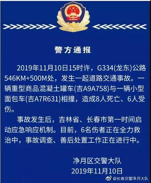 吉林省長春市凈月區(qū)交警大隊(duì)通報(bào)稱:2019年11月10日15時(shí)許,G334(龍東)公路546KM+500M處,發(fā)生一起道路交通事故。一輛重型商品混凝土罐車(吉A9A758)與一輛小型面包車(吉A7R631)相撞,造成8人死亡、6人受傷?! ∈鹿拾l(fā)生后,吉林省、長春市第一時(shí)間啟動(dòng)應(yīng)急響應(yīng)機(jī)制。目前,6名傷者正在全力救治中,事故調(diào)查、善后處置工作正在進(jìn)行中。 通報(bào)原文如下: