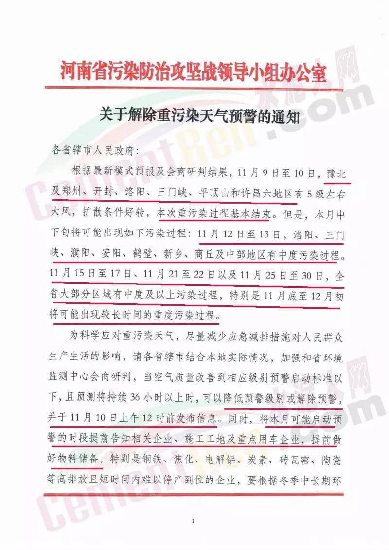另外根據(jù)省、市最新模式預報,11月15日至17日,11月21日至22日以及11月25日至30日鄭州市將存在中度及以上污染過程,請各單位提前告知相關(guān)企業(yè)、施工工地及重點用車企業(yè),提前調(diào)整生產(chǎn)計劃,做好下一輪重污染天氣預警管控準備工作。文件原文如下: