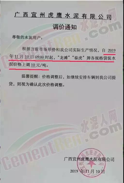 由于目前原材料上漲,成本升高的原因。故此將我廠品牌水泥:統(tǒng)一上調(diào)30元/噸。調(diào)整時間定于:2019年11月10日15點00分,謝謝!
