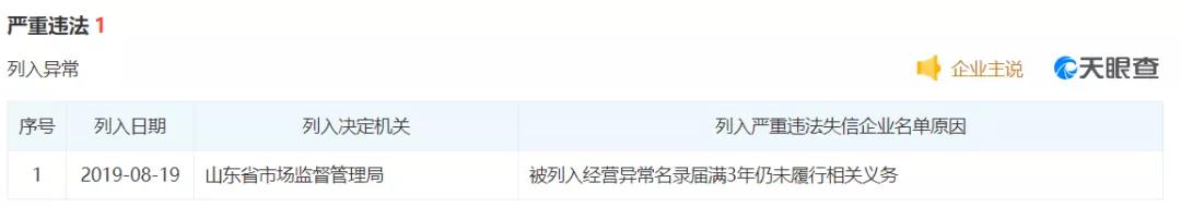 天眼查數(shù)據(jù)顯示一項嚴重違法,被列入嚴重違法失信企業(yè)名單原因為異常名錄屆滿3年未履行相關(guān)義務(wù)。