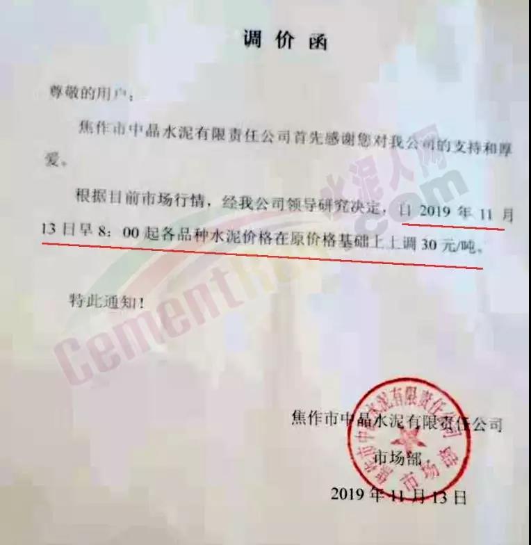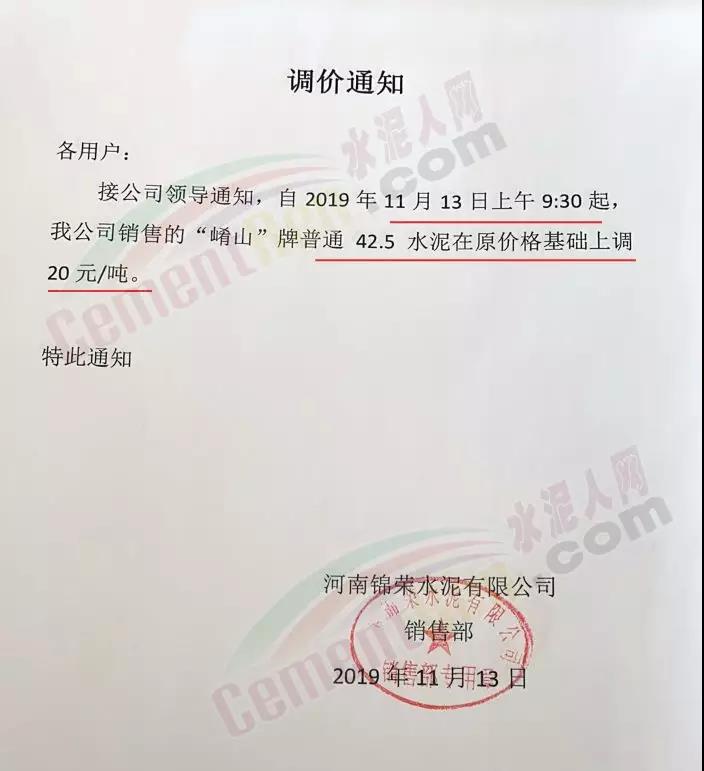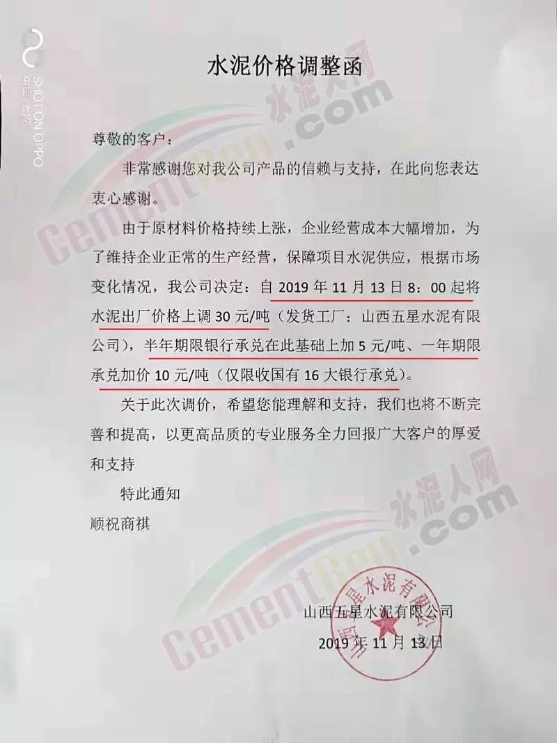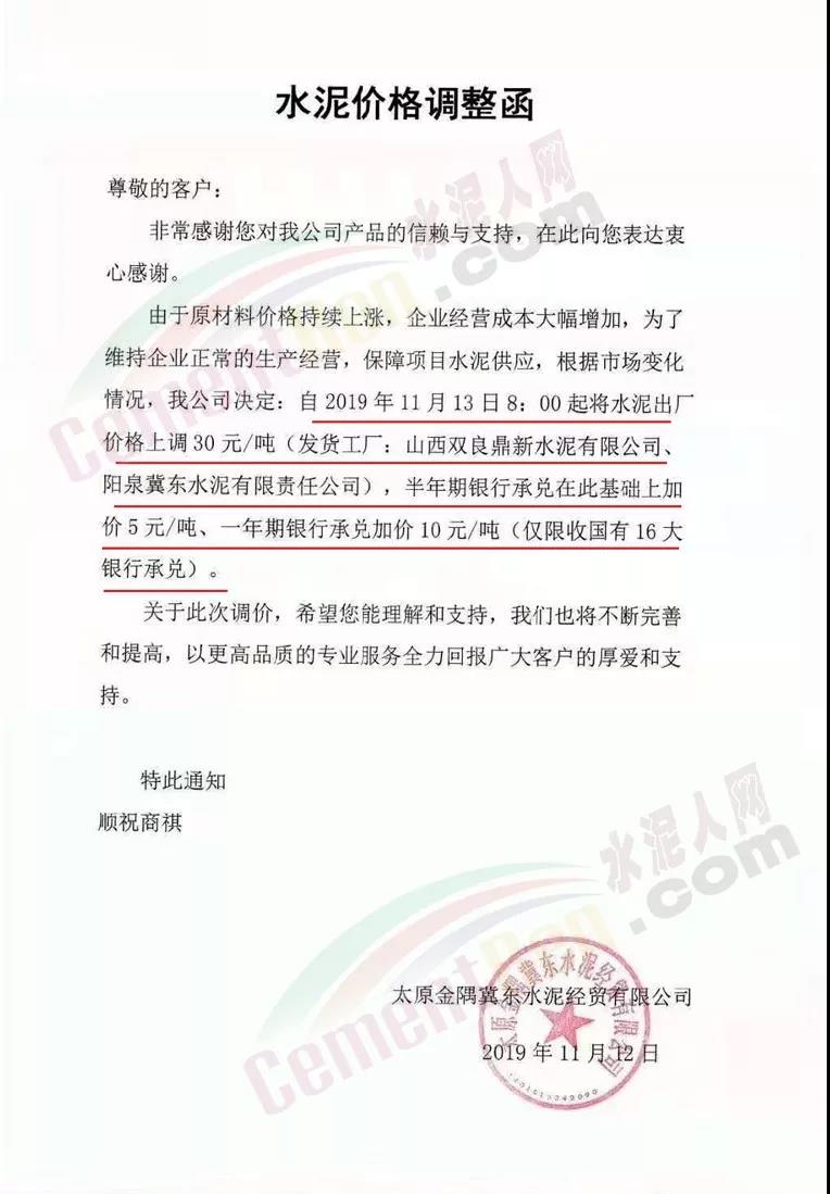 太原山水水泥有限公司水泥價(jià)格調(diào)整通知函稱,由于近期市場(chǎng)變化和環(huán)保嚴(yán)峻的形勢(shì)影響,原材料成本不斷上升、人工成本增加,企業(yè)經(jīng)營(yíng)成本大升。為保證公司維持正常經(jīng)營(yíng)狀態(tài),公司決定于11月13日8時(shí)起將公司P.O42.5散裝水泥出廠價(jià)在原有的基礎(chǔ)上上調(diào)30元/噸。