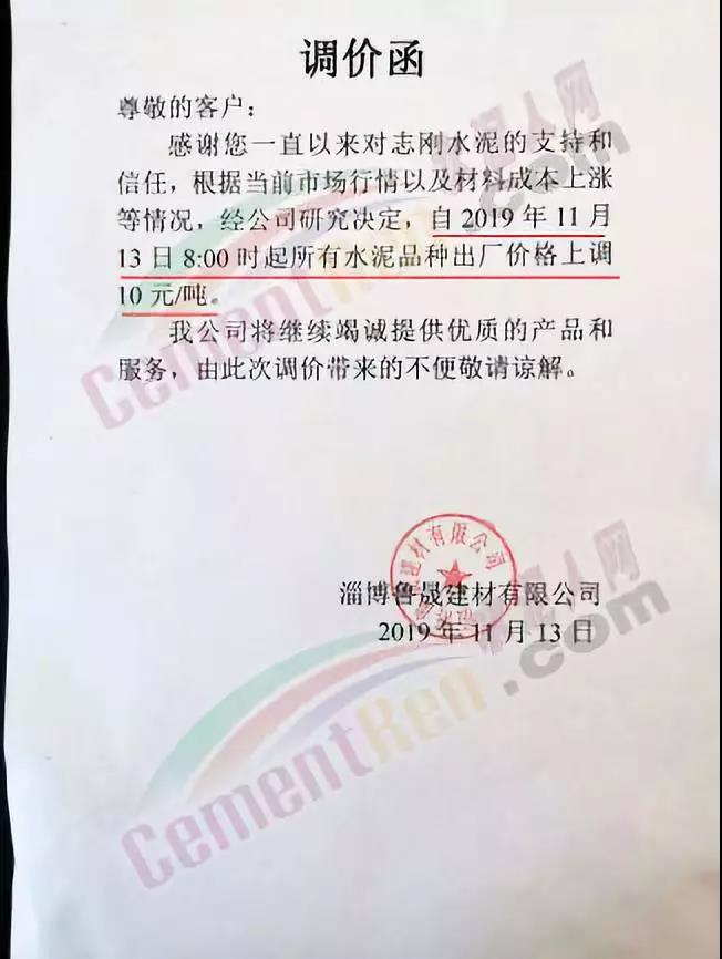 淄博魯晟建材有限公司通知自11月13日早8時(shí)起所有水泥出廠價(jià)格上調(diào)10元/噸。