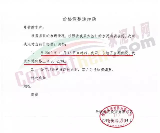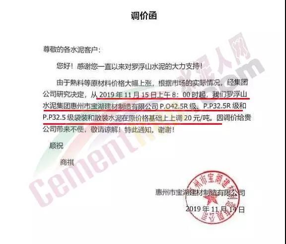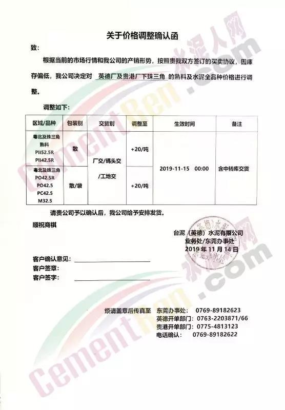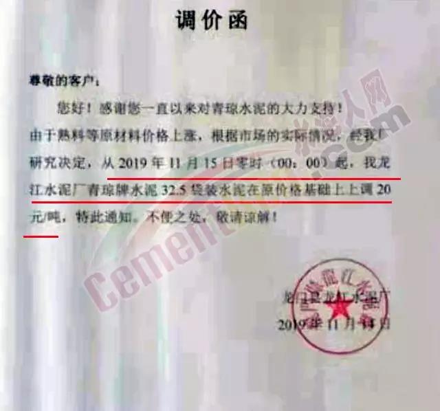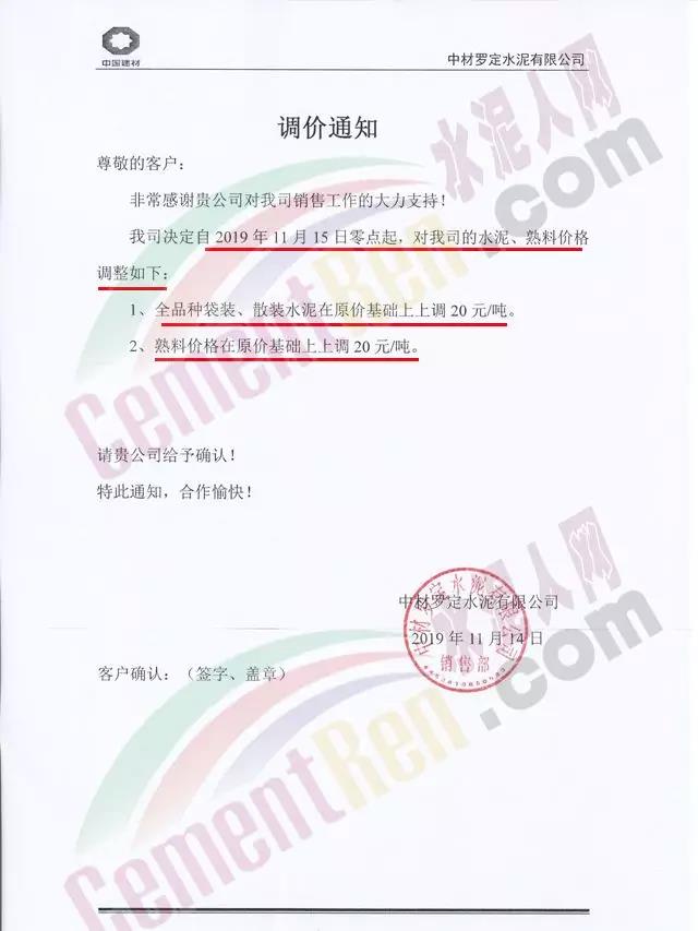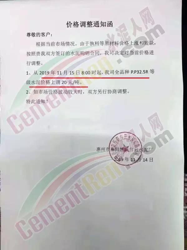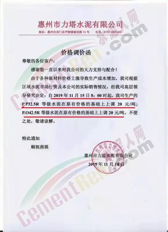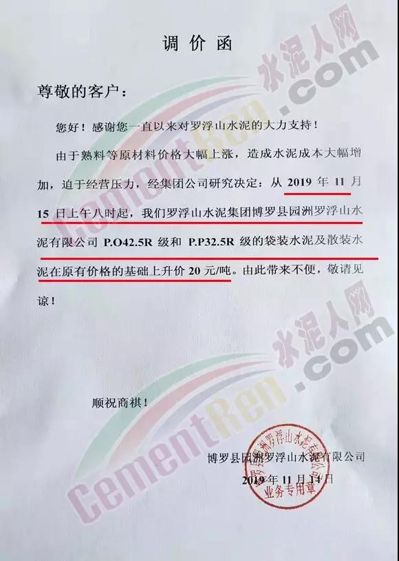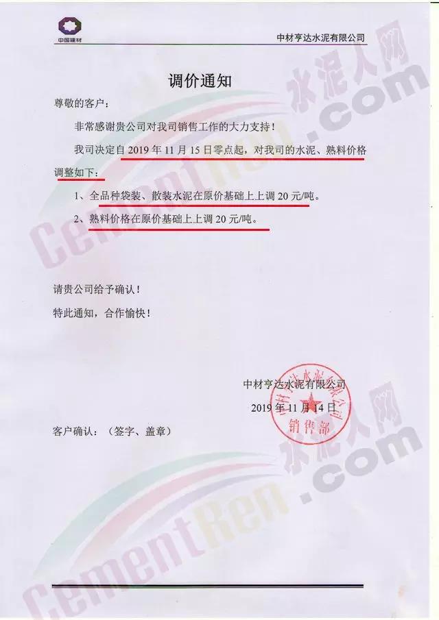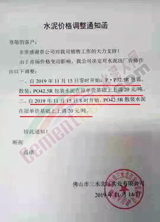 尊敬的客戶:根據(jù)市場(chǎng)行情及公司原材料庫(kù)存與進(jìn)項(xiàng)變化,我公司自2019年11月14日八點(diǎn)時(shí)起:對(duì)32.5級(jí)散裝水泥在原有的價(jià)格基礎(chǔ)上每噸上調(diào)30元,袋裝每噸上調(diào)30元。(滁州金瑞水泥有限公司)