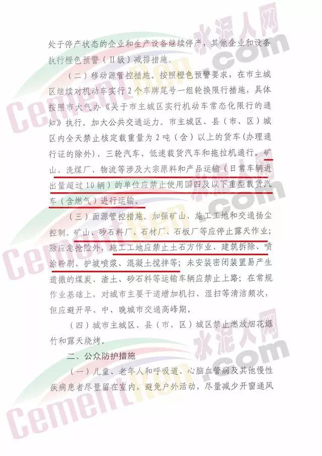 揚塵源減排措施。礦山、砂石料廠、石材廠、石板廠等停止露天作業(yè);施工工地停止土石方作業(yè)(包括停止建筑拆除、土石方開挖、回填、場內(nèi)倒運、摻拌石灰、混凝土剔鑿等作業(yè),停止建筑工程配套道路和管溝開挖作業(yè));建筑垃圾清運車輛和砂石運輸車輛禁止上路行駛,開挖土石方的挖掘機等非道路移動機械停止作業(yè)。