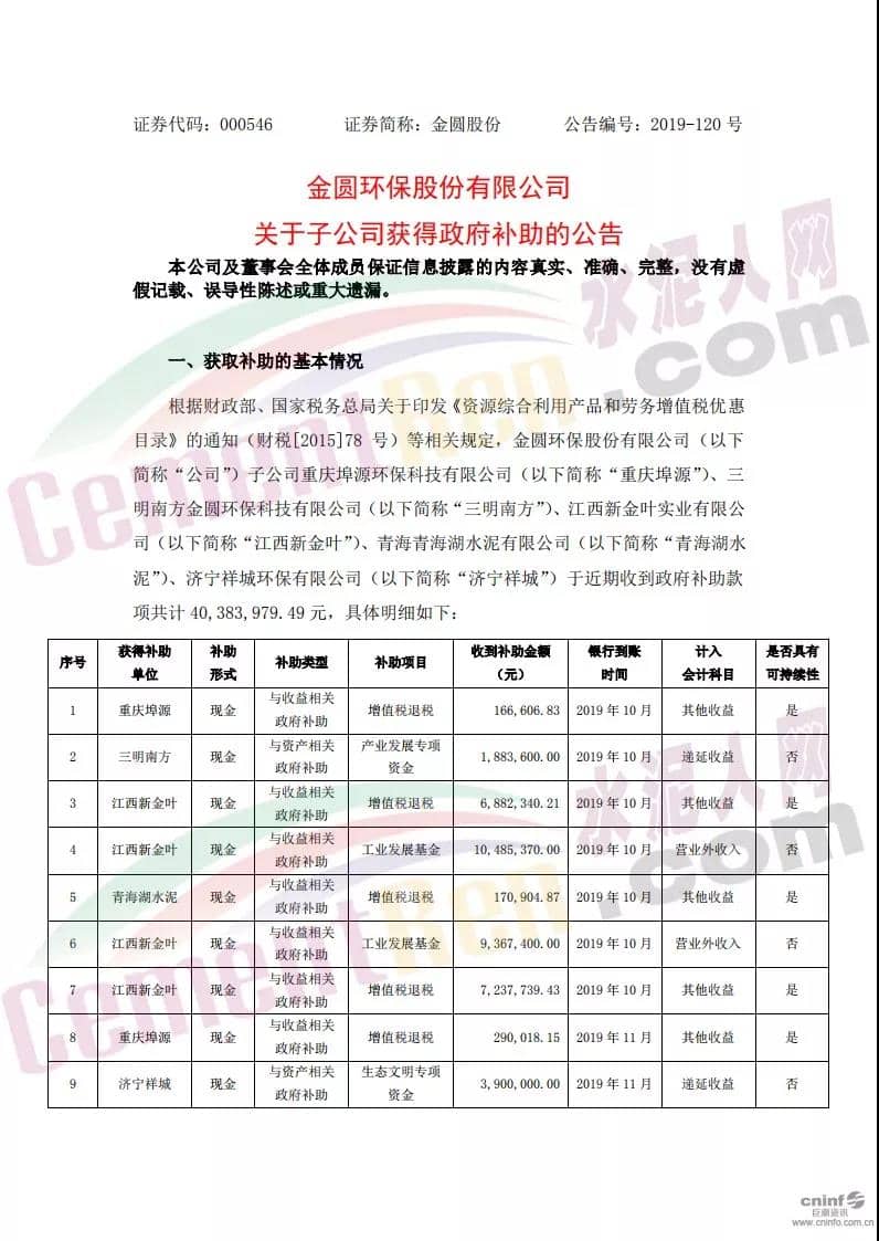 這四項補貼項目共40,383,979.49 元,其中工業(yè)發(fā)展基金共10579044.00元,增值稅退稅共14747609.49元,生態(tài)文明專項資金共3900000元,產(chǎn)業(yè)發(fā)展專項資金共1883600元。具體明細如下: