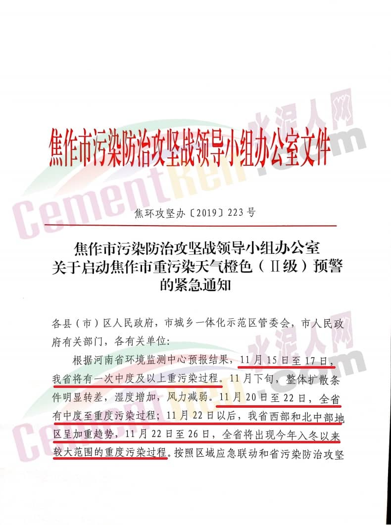 11月15日,焦作市生態(tài)環(huán)境局發(fā)布了《焦作市污染防治攻堅(jiān)戰(zhàn)領(lǐng)導(dǎo)小組辦公室關(guān)于啟動焦作市重污染天氣橙色(Ⅱ級)預(yù)警的緊急通知 》稱自2019年11月15日12時(shí)起,啟動重污染天氣橙色(Ⅱ級)警,解除時(shí)間另行通知。通知原文如下: