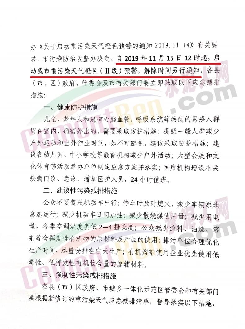 11月14日衡水市也發(fā)布了《衡水市發(fā)布重污染天氣黃色預(yù)警》稱,根據(jù)省應(yīng)急預(yù)警中心《關(guān)于近期空氣質(zhì)量預(yù)測及管控建議的函》精神,省環(huán)境應(yīng)急與重污染天氣預(yù)警中心與中國環(huán)境監(jiān)測總站、省環(huán)境氣象中心聯(lián)合會商,預(yù)計(jì)11月15日起,受弱南風(fēng)持續(xù)影響,地面濕度增大,大氣擴(kuò)散條件轉(zhuǎn)差,我市空氣質(zhì)量可能出現(xiàn)PM2.5重度污染過程。按上級要求,經(jīng)市大氣污染防治工作領(lǐng)導(dǎo)小組批準(zhǔn),現(xiàn)向全市發(fā)布重污染天氣黃色預(yù)警,定于2019年11月15日8時(shí)至17日18時(shí)啟動Ⅲ級應(yīng)急響應(yīng)。
