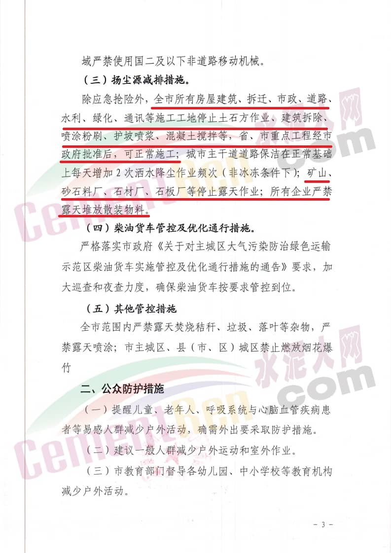 工業(yè)企業(yè)必須嚴(yán)格落實新修訂的應(yīng)急減排措施清單中停限產(chǎn)措施,建材行業(yè)全部停產(chǎn)(包括水泥行業(yè)、采石采砂行業(yè)等),涉保障民生供熱任務(wù)的工業(yè)企業(yè)嚴(yán)格執(zhí)行以熱定產(chǎn)、以氣定產(chǎn);供應(yīng)重點工程物流的工業(yè)企業(yè)嚴(yán)格按照《關(guān)于重污染天氣允許重點工程項目施工建設(shè)的復(fù)函》執(zhí)行以量定產(chǎn)要求。