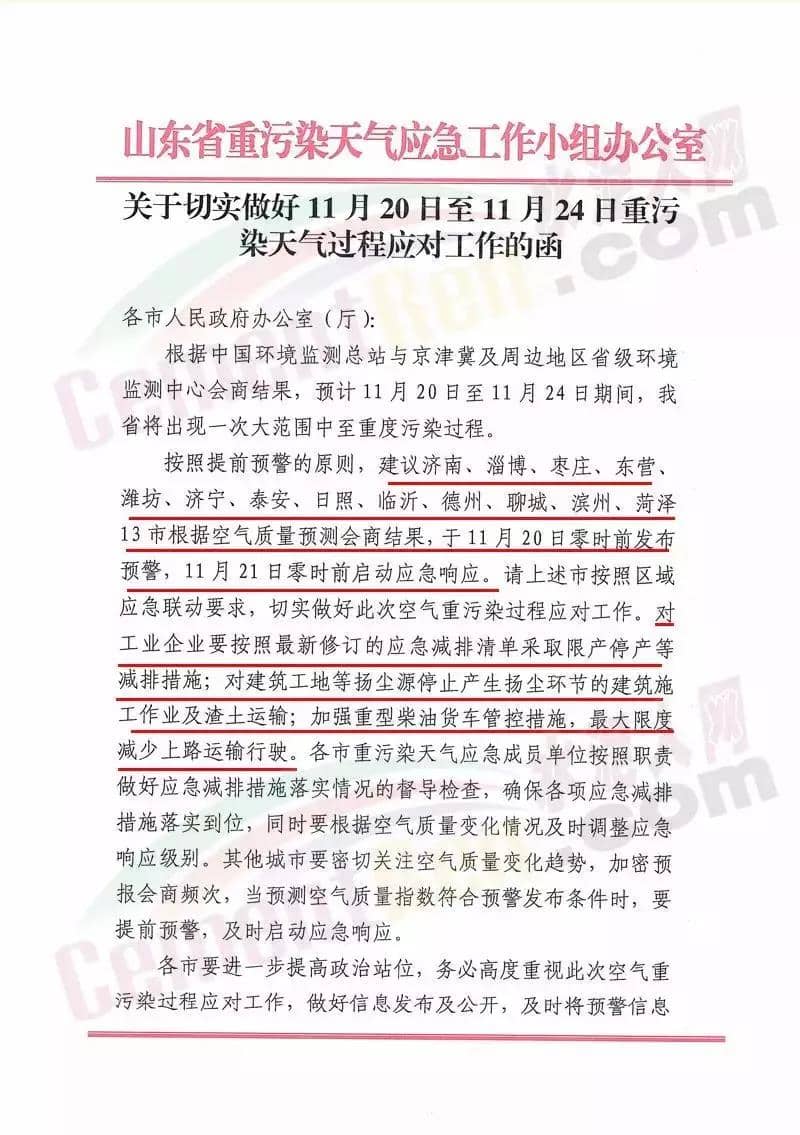 11月19日山東省重污染天氣應(yīng)急工作小組辦公室發(fā)布通知,建議濟(jì)南、淄博 、棗莊、東營(yíng)、維坊、濟(jì)寧、泰安、日照、臨沂、德州、聊城、濱州、菏澤13市根據(jù)空氣質(zhì)量預(yù)測(cè)會(huì)商結(jié)果,于11月20日零時(shí)前發(fā)布預(yù)警,11月21日零時(shí)前應(yīng)動(dòng)應(yīng)急響應(yīng)。預(yù)警期間對(duì)工業(yè)企業(yè)要按照最新修訂的應(yīng)急減排清單采取限產(chǎn)停產(chǎn)等減排措施;對(duì)建筑 工地等揚(yáng)塵源停止產(chǎn)能揚(yáng)塵環(huán)節(jié)的建筑施工作業(yè)及渣土運(yùn)輸;加強(qiáng)重型柴油貨車管控措施,最大限度減少上路運(yùn)輸行駛等。