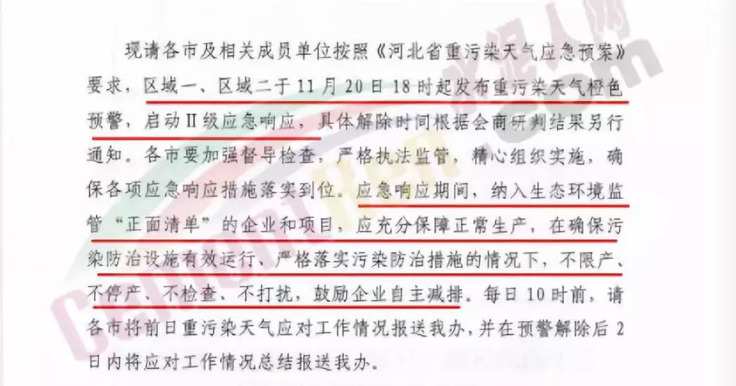 河北省大氣污染防治工作領(lǐng)導(dǎo)小組辦公室通知文件稱要求區(qū)域一(石家莊、保定、衡水、邢臺(tái)、邯鄲、定州、辛集、雄安新區(qū))、區(qū)域二(唐山、廊坊、滄州、秦皇島)將于11月20日18時(shí)起發(fā)布重污染天氣橙色預(yù)警,啟動(dòng)II級(jí)應(yīng)急響應(yīng)。應(yīng)急響應(yīng)期間,納入生態(tài)環(huán)境監(jiān)管“正面清單”的企業(yè)和項(xiàng)目,應(yīng)充分保障正常生產(chǎn),在確保污染防治設(shè)施有效運(yùn)行、嚴(yán)格落實(shí)污染防治措施的情況下,不限產(chǎn)、不停產(chǎn)、不檢查、不打擾,鼓勵(lì)企業(yè)自主減排。