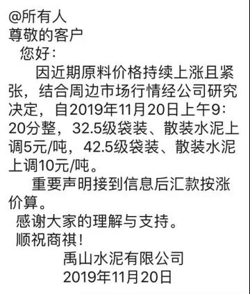 淮北市天助水泥公司通知稱:由于原材料價(jià)格上漲且供應(yīng)緊張,經(jīng)公司研究決定自2019年11月20日早上八點(diǎn)起,所以品種袋散價(jià)格上調(diào)10元每噸。