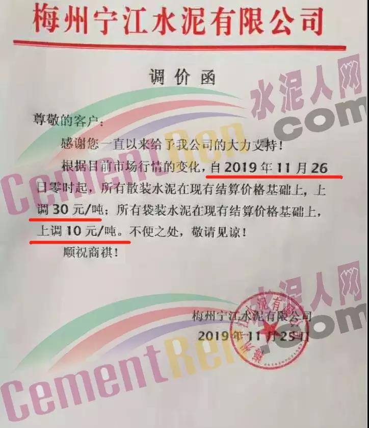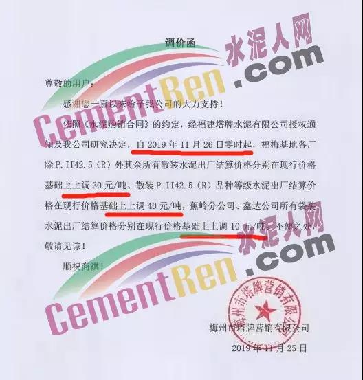 梅州市塔牌營(yíng)銷有限公司發(fā)布了調(diào)價(jià)函稱,依照《水泥購銷合同》的約定,決定自2019年11月26日零時(shí)起,福梅基地各廠除P.II42.5(R)外其余所有散裝水泥出廠結(jié)算價(jià)格在現(xiàn)行價(jià)格基礎(chǔ)上上調(diào)30元/噸,散裝P.II42.5(R)品種等級(jí)水泥出廠結(jié)算價(jià)格在現(xiàn)行價(jià)格基礎(chǔ)上上調(diào)40元/噸,蕉嶺分公司、鑫達(dá)分公司所有袋裝水泥出廠結(jié)算價(jià)格分別在現(xiàn)行價(jià)格基礎(chǔ)上上調(diào)10元/噸。